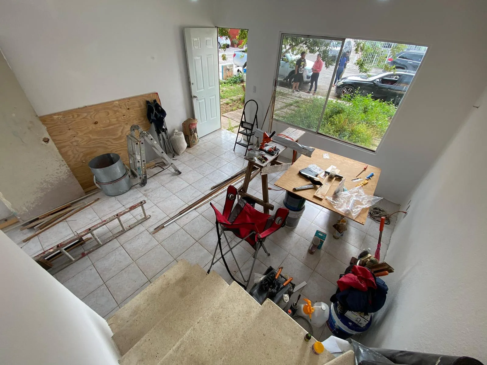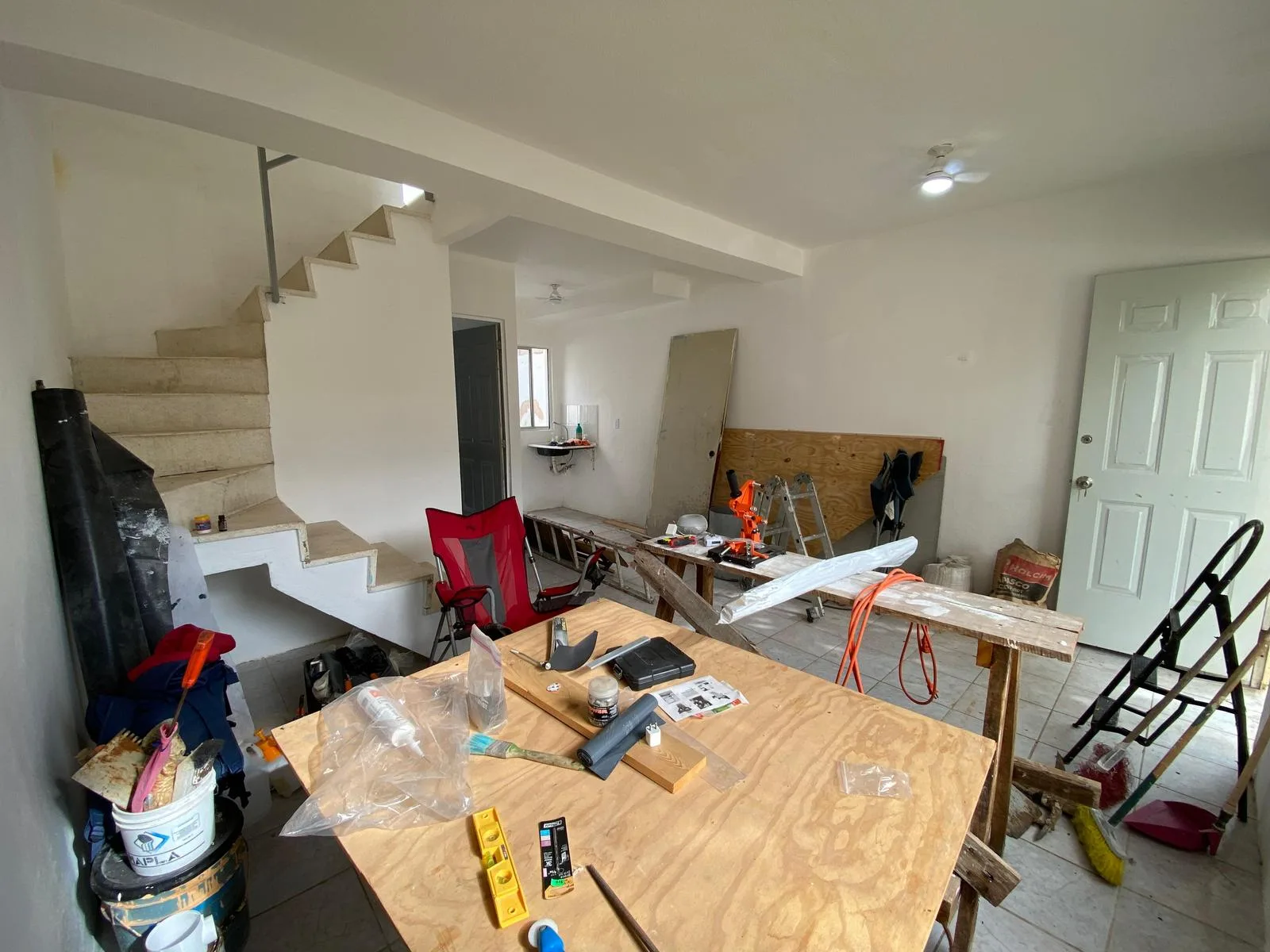 The interior includes a living and dining area with ceiling fans and a compact kitchen. The house comprises two levels.