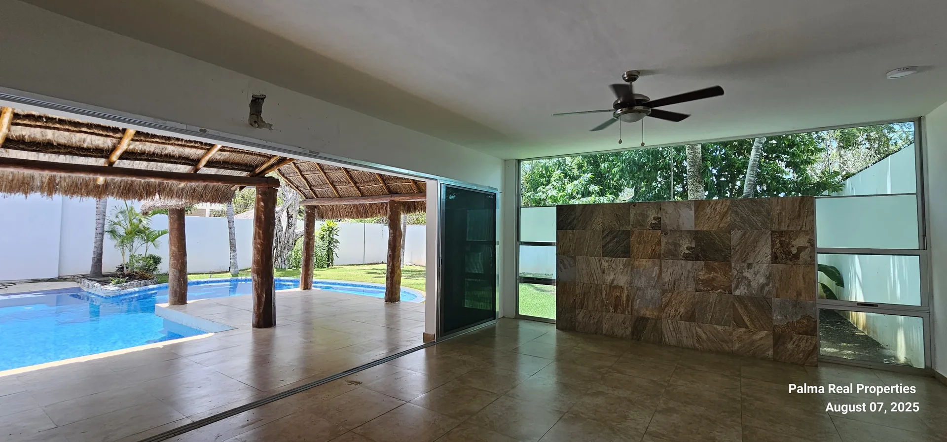 Exterior amenities include a covered terrace with a palapa, a large pool, and a garden. The garage accommodates four cars with an electric door. Additional spaces include storage, a laundry room, and service areas.