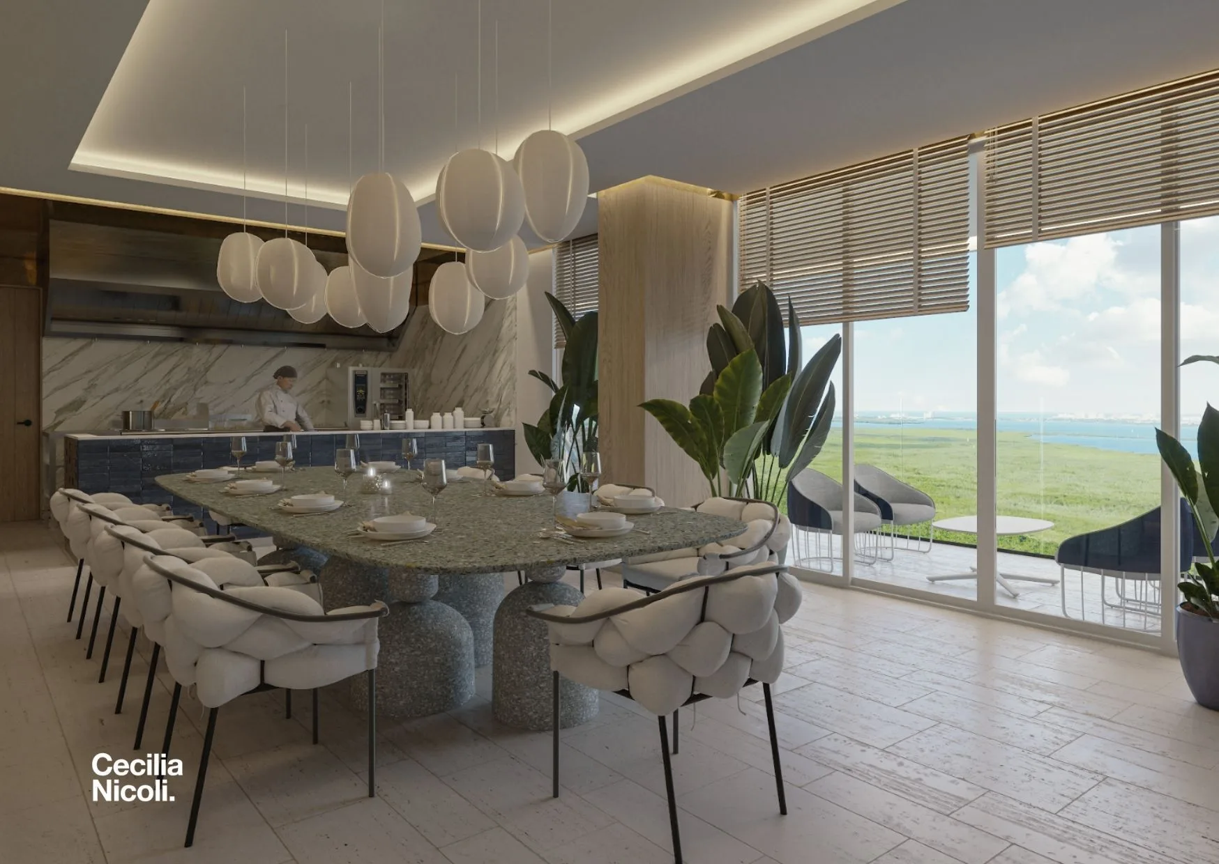 Residents have access to over 50 exclusive amenities and services. These include a Beach Club at Isla Blanca, family and adult swimming pools, a spa, gym, and sports courts. There is a playroom, video game area, and a Sports Bar. Additional facilities include coworking spaces, meeting rooms, a cinema, a Speakeasy, and a Music Hall. The property features a gourmet restaurant, a wine cellar, and a rooftop with 360-degree views of the lagoon, mangroves, sea, Hotel Zone, and Isla Mujeres. Laundry facilities, 24/7 security, and complimentary transportation to the airport and the Beach Club are also provided.