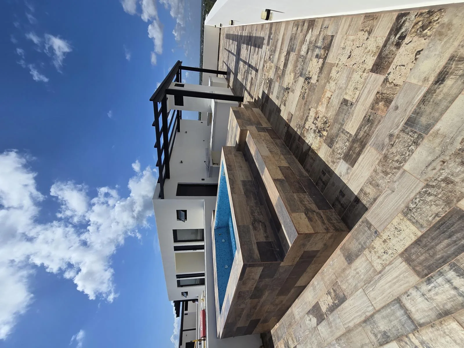 The upper level is dedicated to a private rooftop terrace. The terrace is equipped with a jacuzzi, a pergola, and a bar area. It also includes a bathroom with a sink and has dedicated gardening areas.