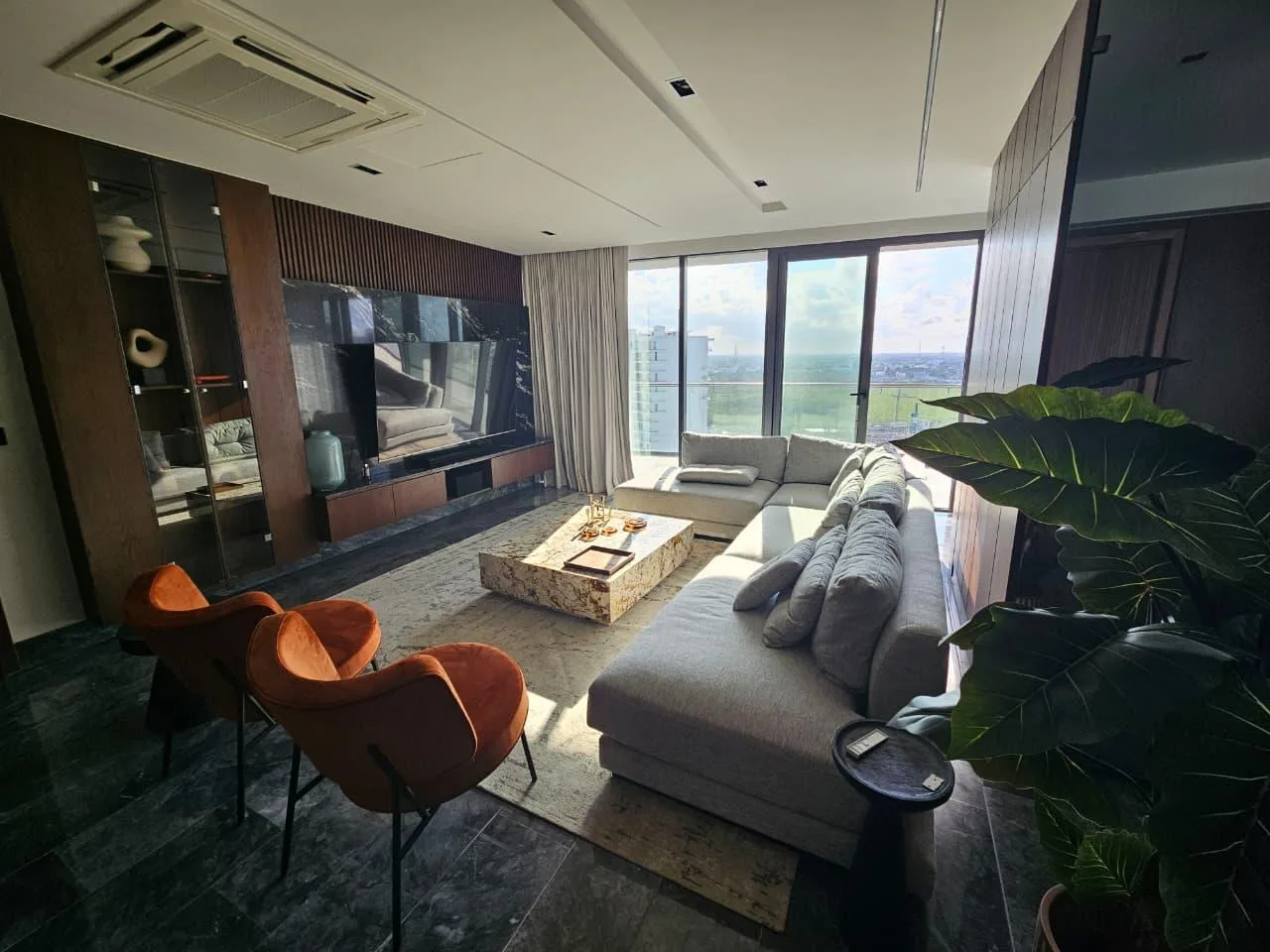 The penthouse features three bedrooms, each with a walk-in closet and an en-suite bathroom offering panoramic views. It includes a service room with a bathroom and closet. The living and dining area receives ample natural light and provides panoramic vistas, and contains a half bathroom. The residence is equipped with a gourmet kitchen and private terraces with views.