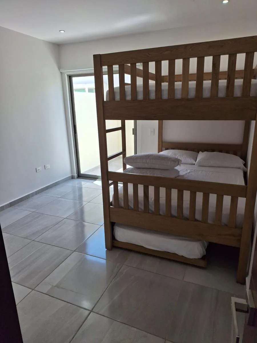 This furnished home comes complete with a curated selection of high-quality furniture and accessories. The well-equipped kitchen includes all necessary appliances. The living room features a comfortable sofa set and a dining set for six. The bedrooms are furnished with a queen-size bed and nightstands, a double bed with nightstands, and a bunk bed that accommodates two double beds and one single bed. A sofa bed and a television are also provided.