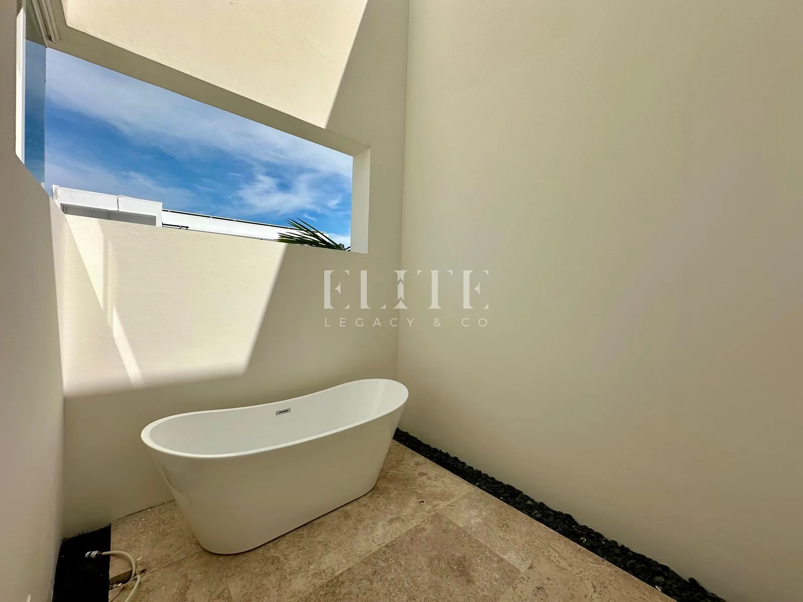 The second level includes a primary bedroom with a large walk-in closet, an outdoor bathtub, and a terrace. There are two secondary bedrooms, one with a walk-in closet and one with a regular closet. This level also has an area for a television or study.