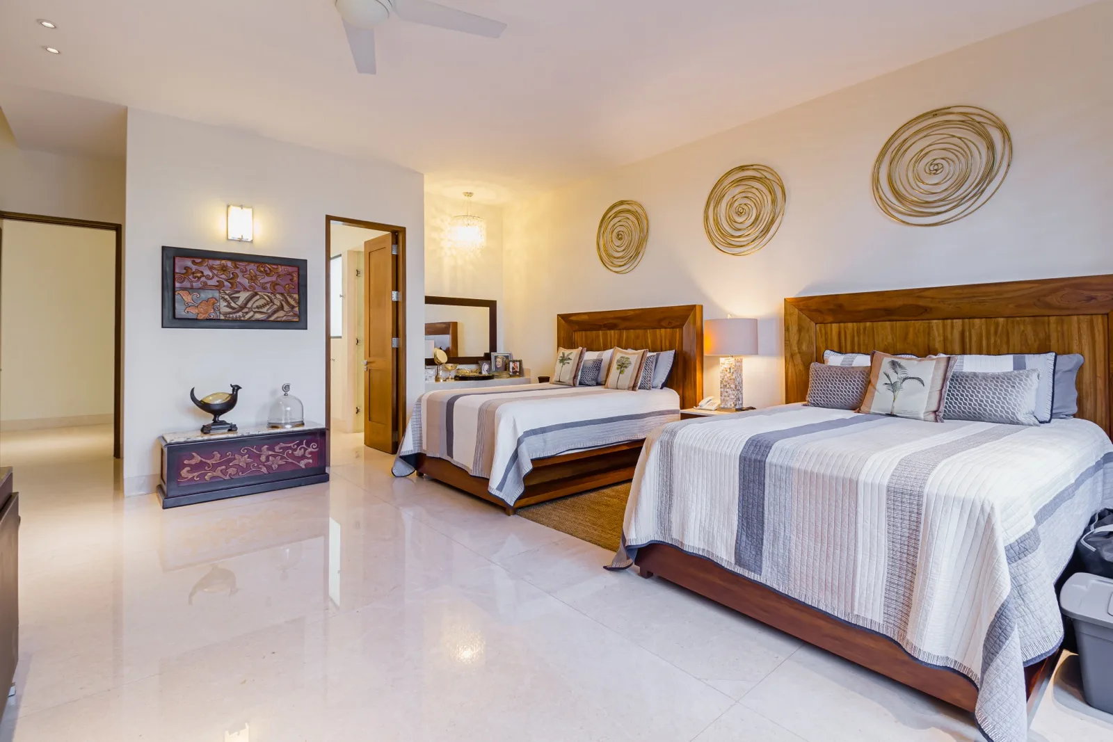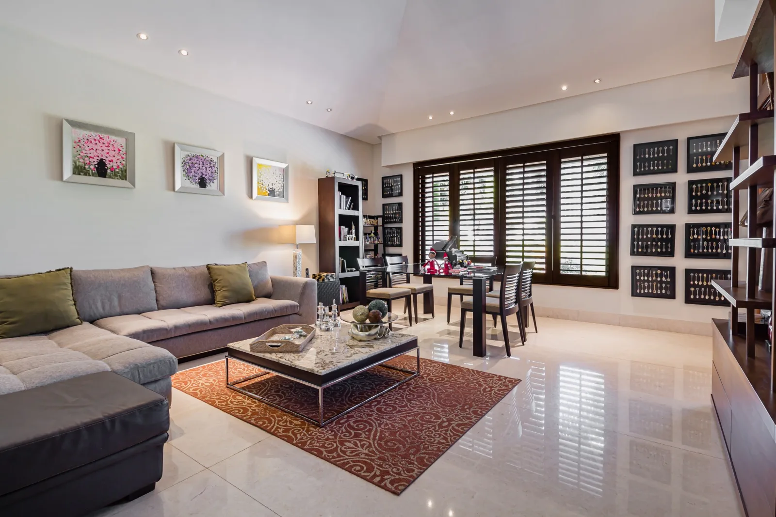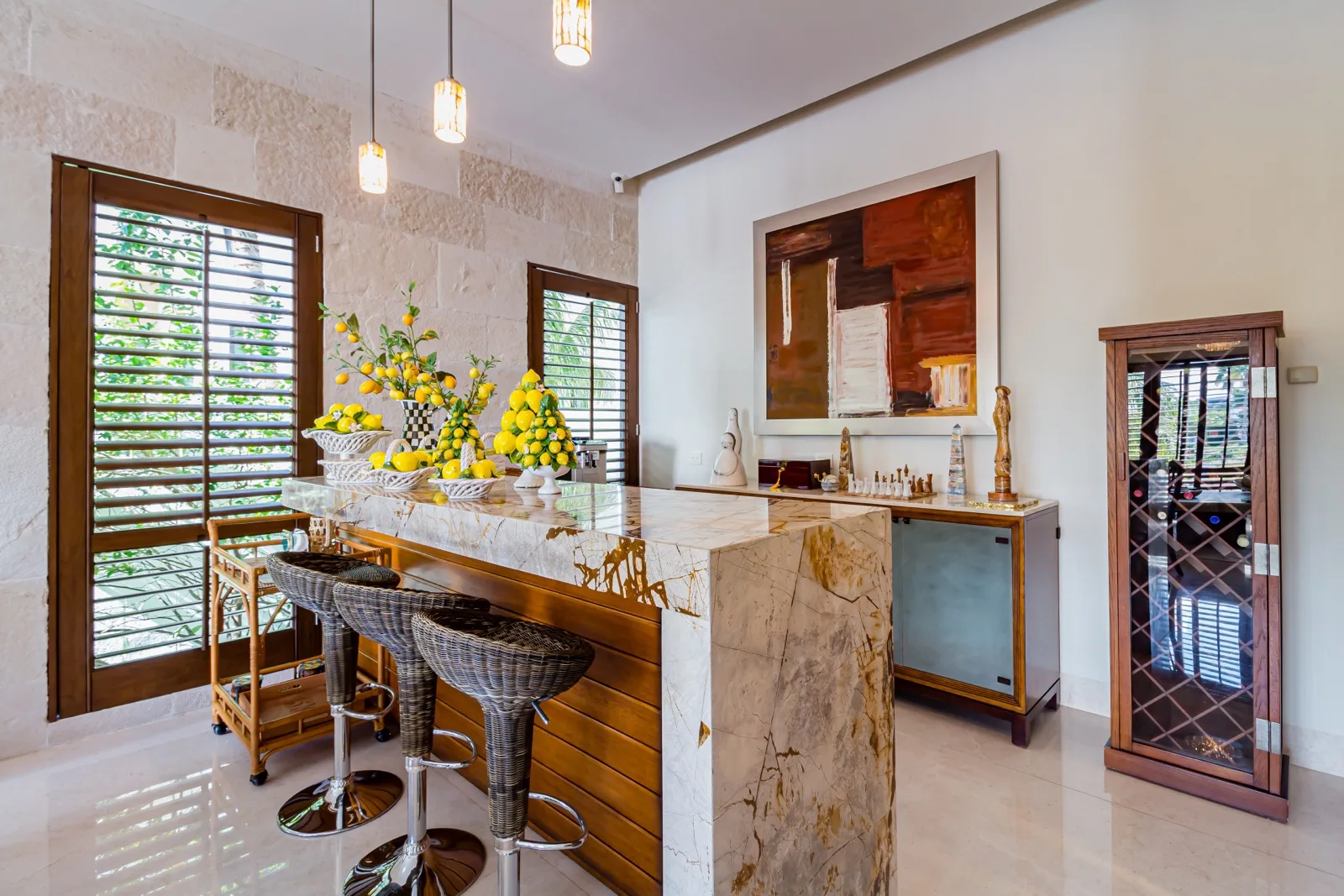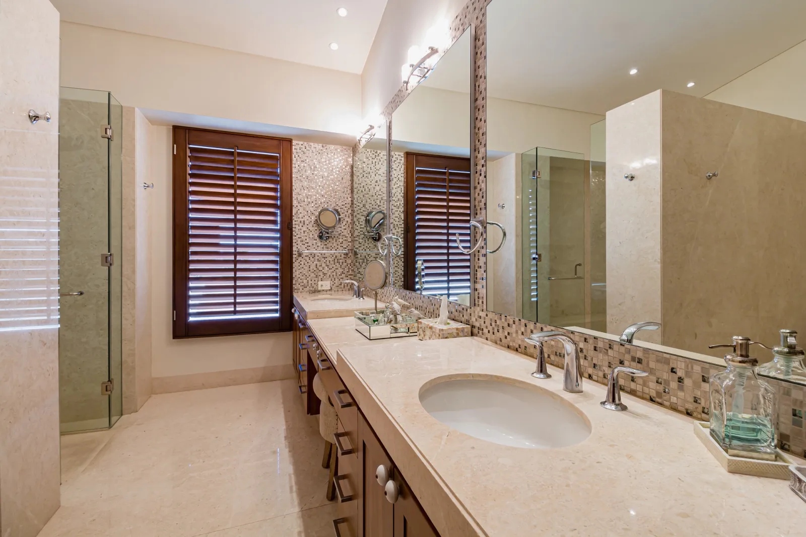 The property includes discreetly integrated hurricane-rated roller shutters, uniform marble flooring, and high-strength Fleetwood aluminum windows. These windows are suited to the local climate due to their resistance to humidity, wind, and salinity, while maximizing natural light and views.