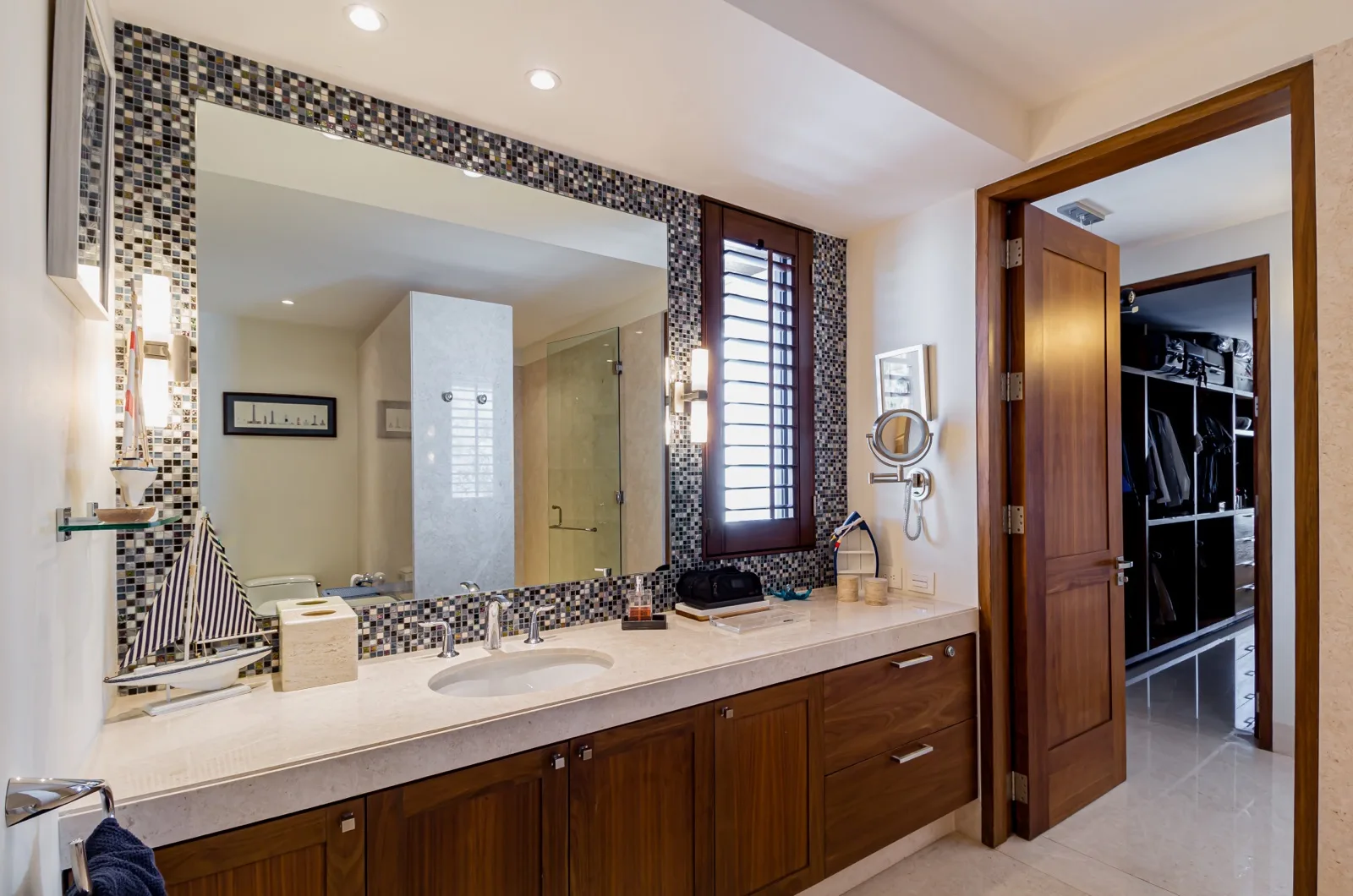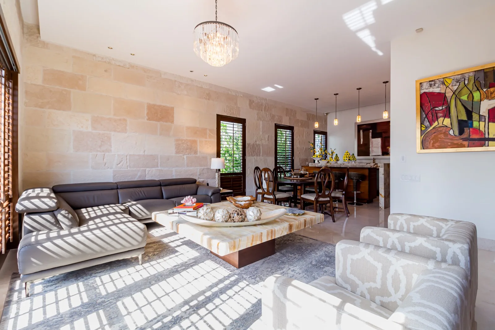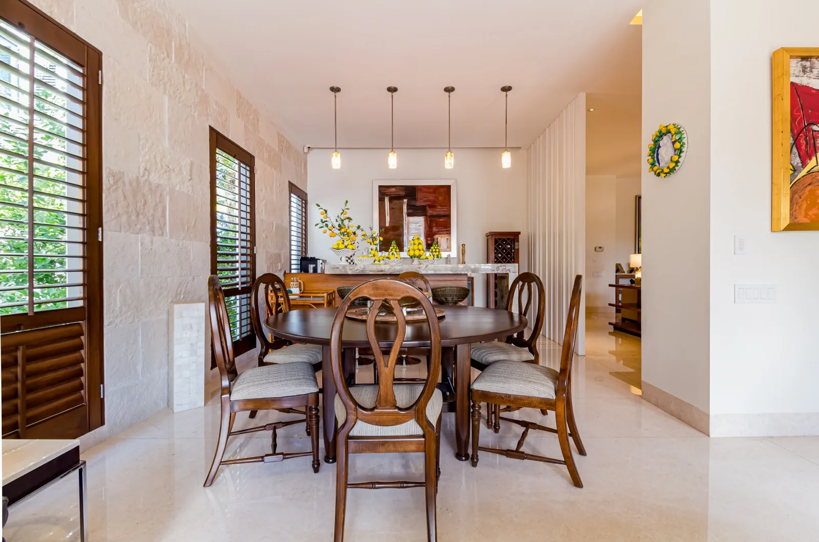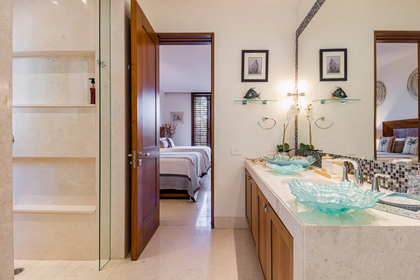 The property includes discreetly integrated hurricane-rated roller shutters, uniform marble flooring, and high-strength Fleetwood aluminum windows. These windows are suited to the local climate due to their resistance to humidity, wind, and salinity, while maximizing natural light and views.