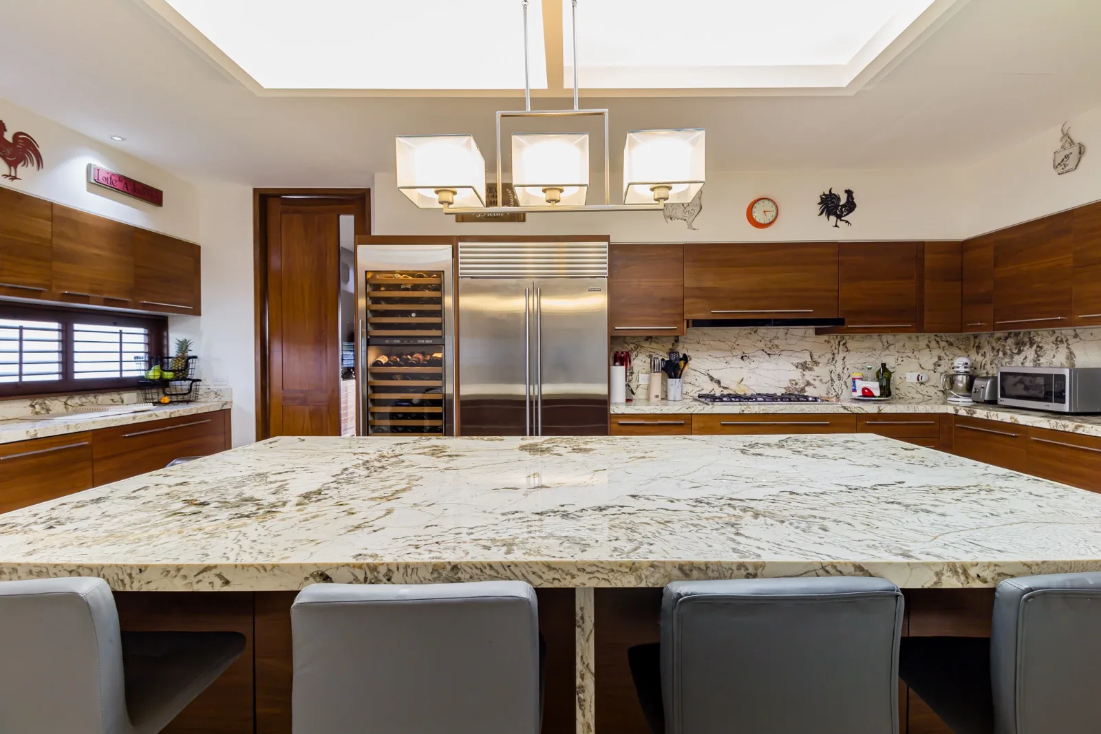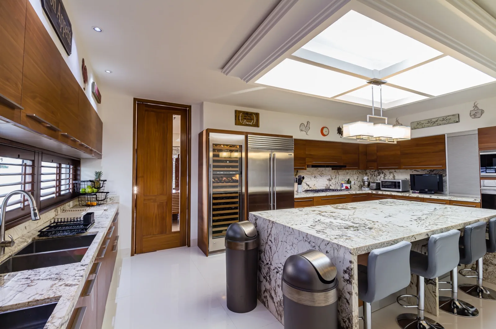 The chef's kitchen is equipped with a Sub-Zero refrigerator and wine cooler, a Viking range, and a Wolf oven and microwave. On the ground floor, the social areas connect to a covered terrace overlooking the garden, swimming pool, and canals. This level includes a living room, dining room, bar, and an informal family gathering area, plus one bedroom.