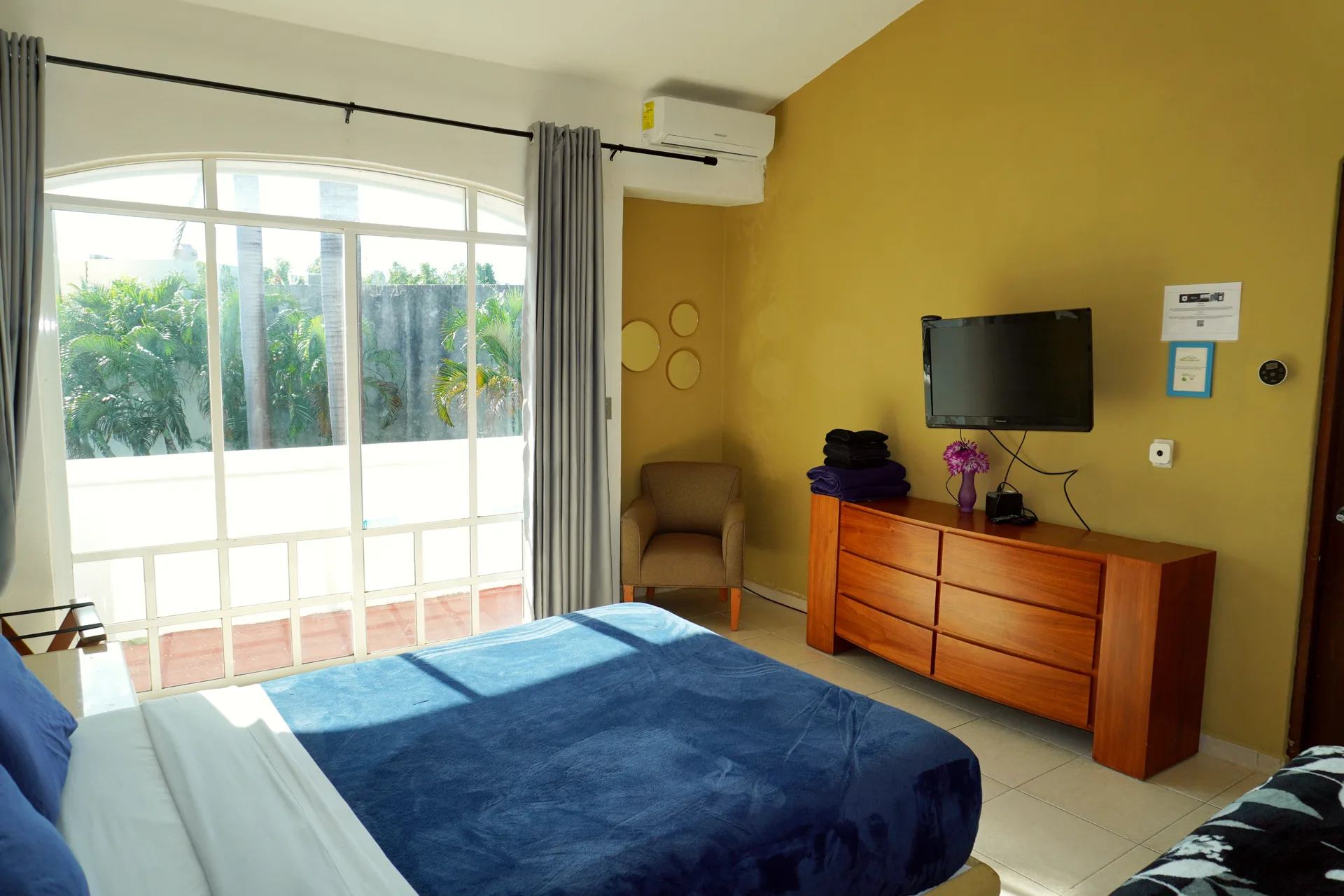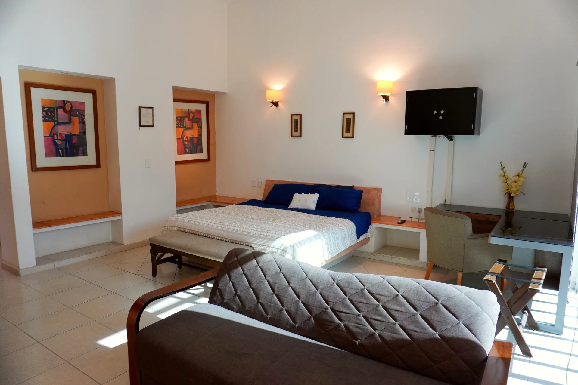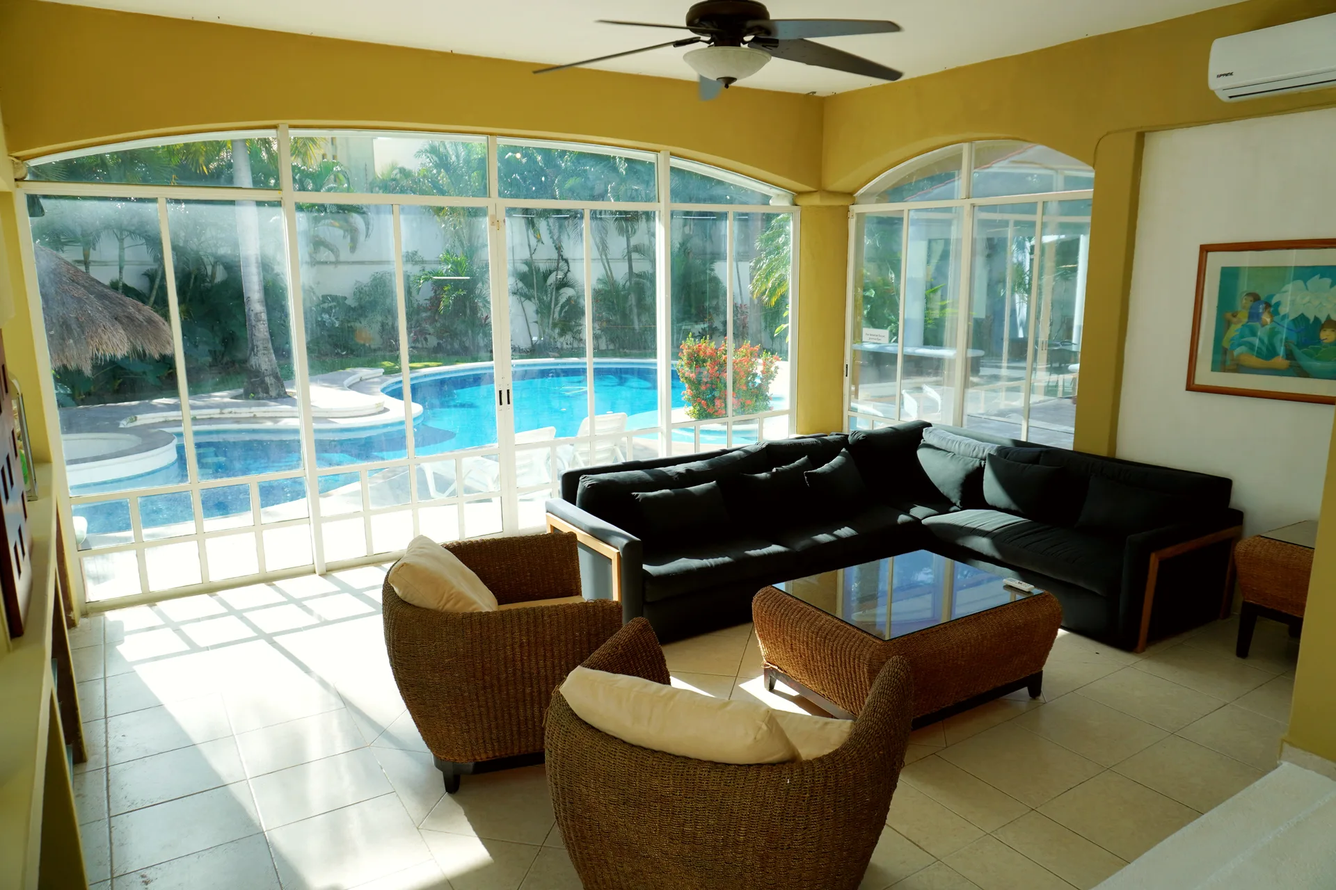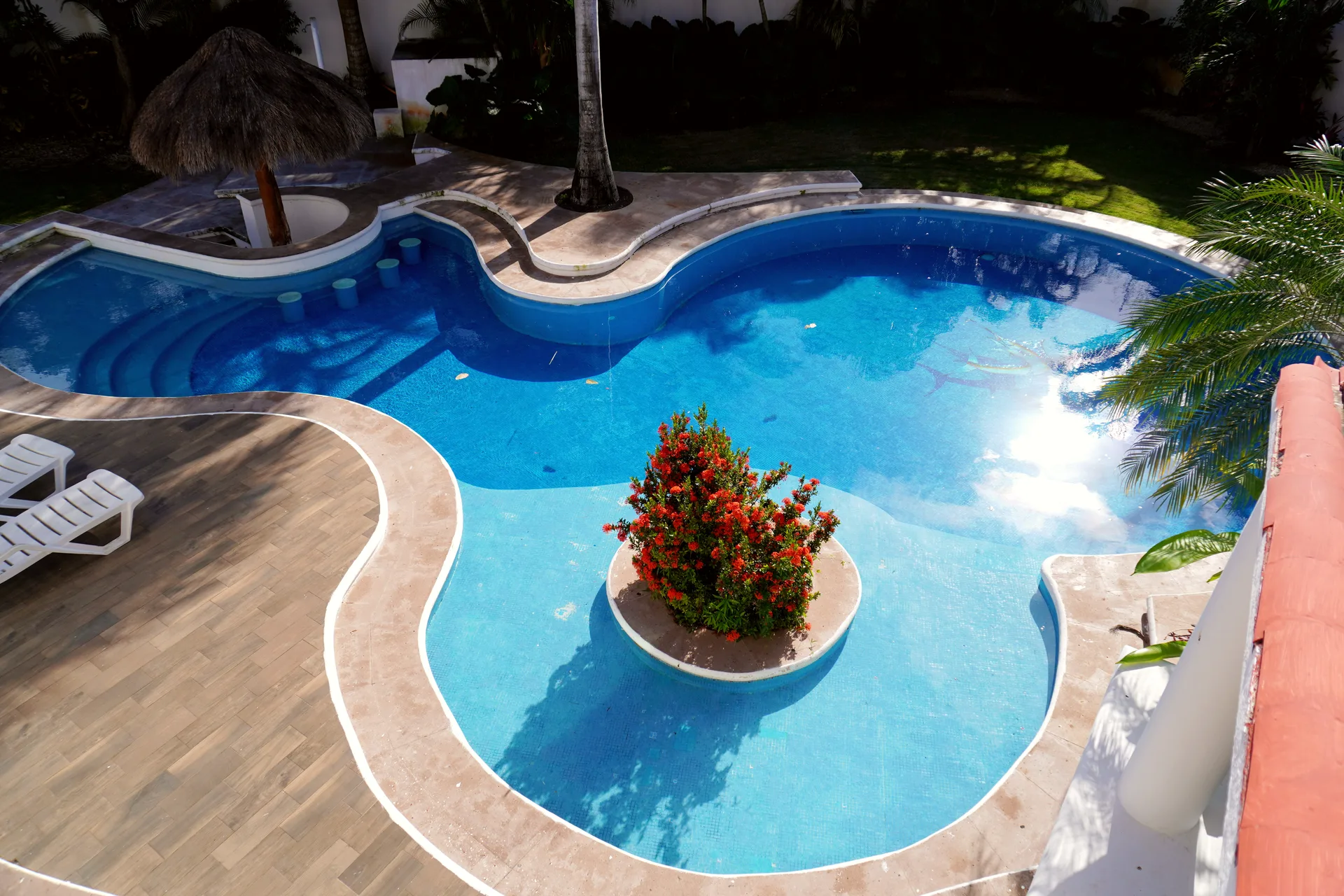 The 1, 239 square meter garden provides ample space. The swimming pool has areas of varying depths, suitable for all ages. A traditional thatched-roof palapa offers shaded space.