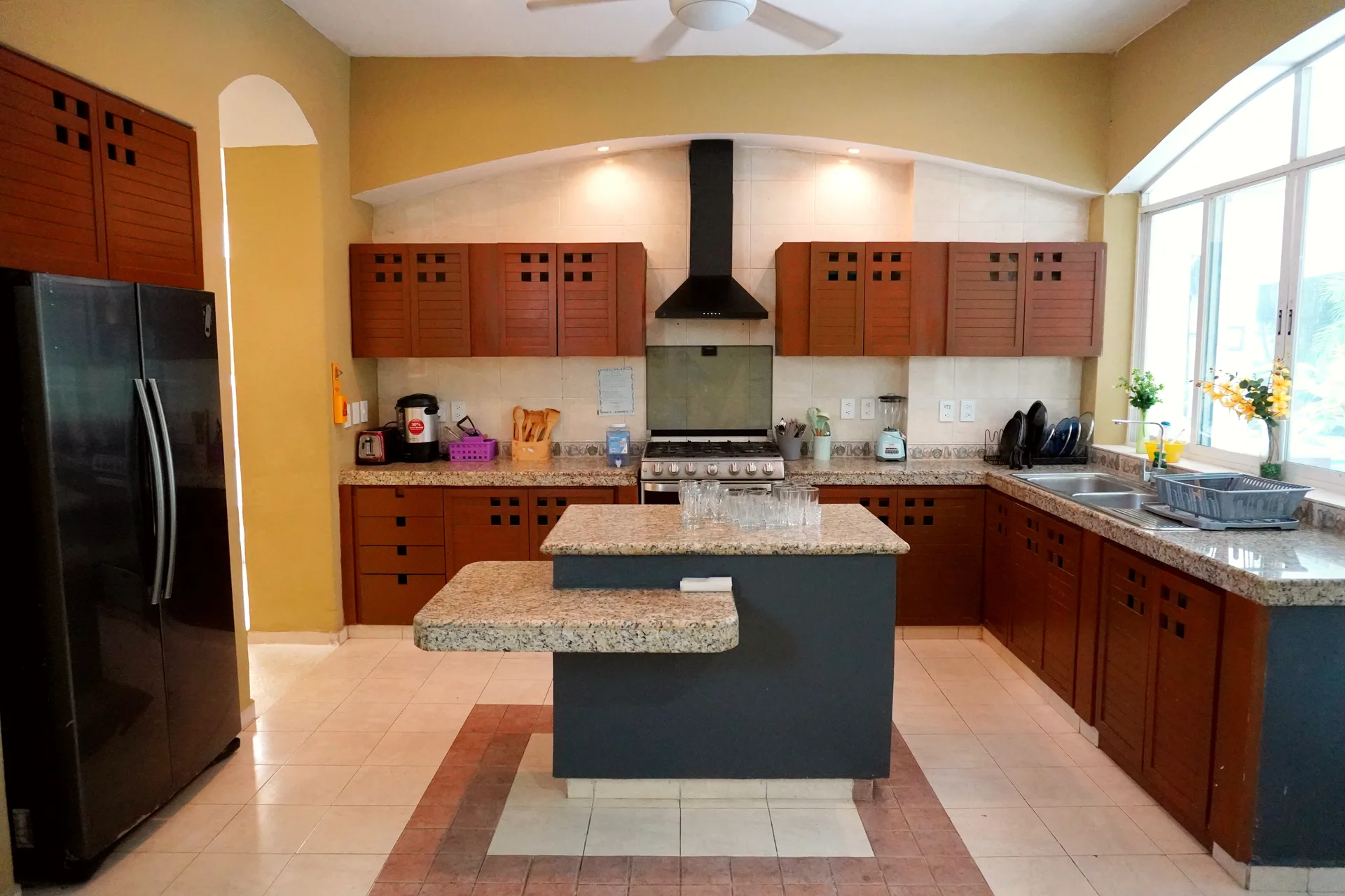 The kitchen is designed for family cooking. It features a central granite island, space for two or three people to work comfortably, and complete equipment suitable for preparing everything from daily breakfast to a Christmas dinner for twenty. The formal dining room includes a parota wood table for eight people.