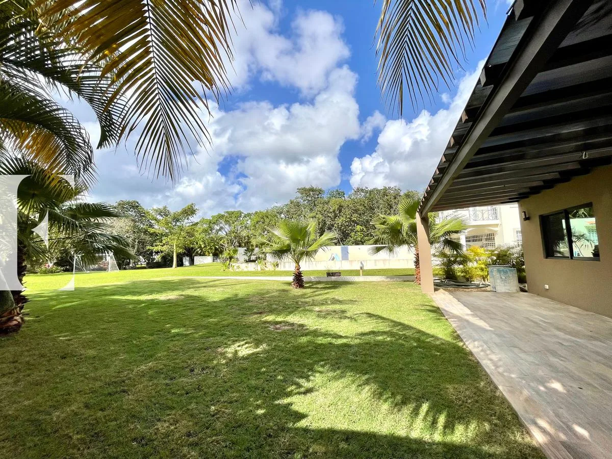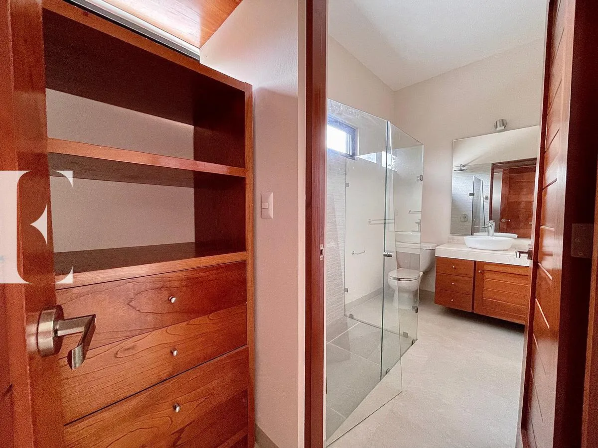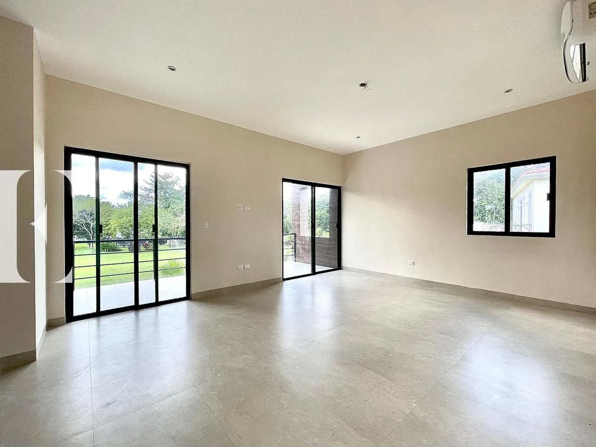 The first level features a double-height living and dining room. There is a study or bedroom with a private bathroom, and a secondary bedroom with a walk-in closet and private bathroom. This level includes a fully equipped kitchen, a pantry, a service room with a private bathroom, and a storage room. It also has a swimming pool, a green backyard area, a service corridor, and covered parking for four cars.