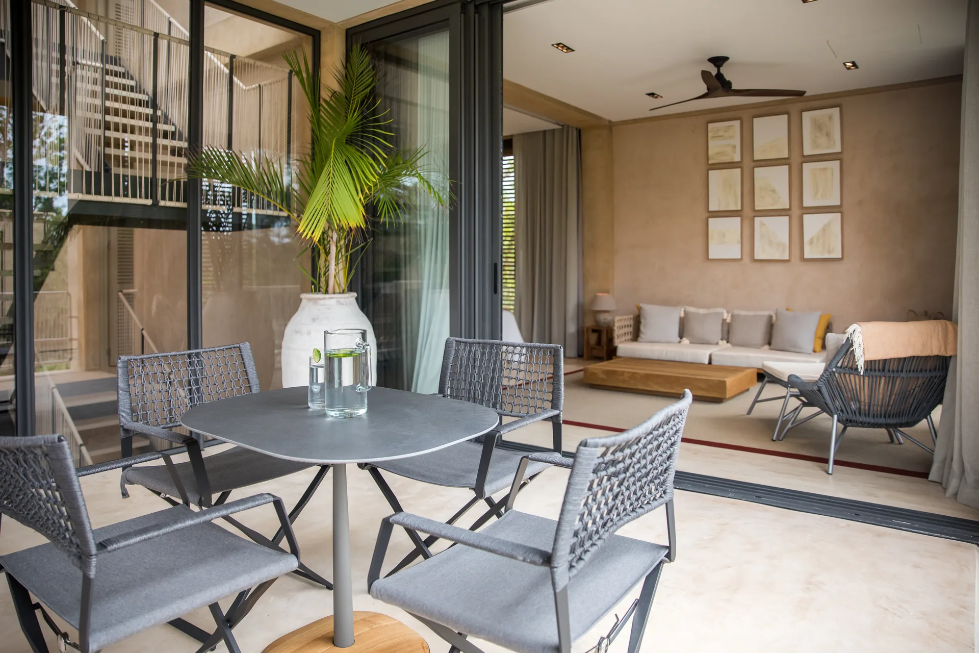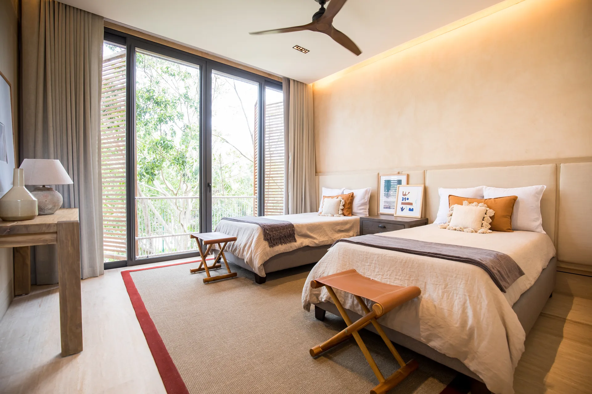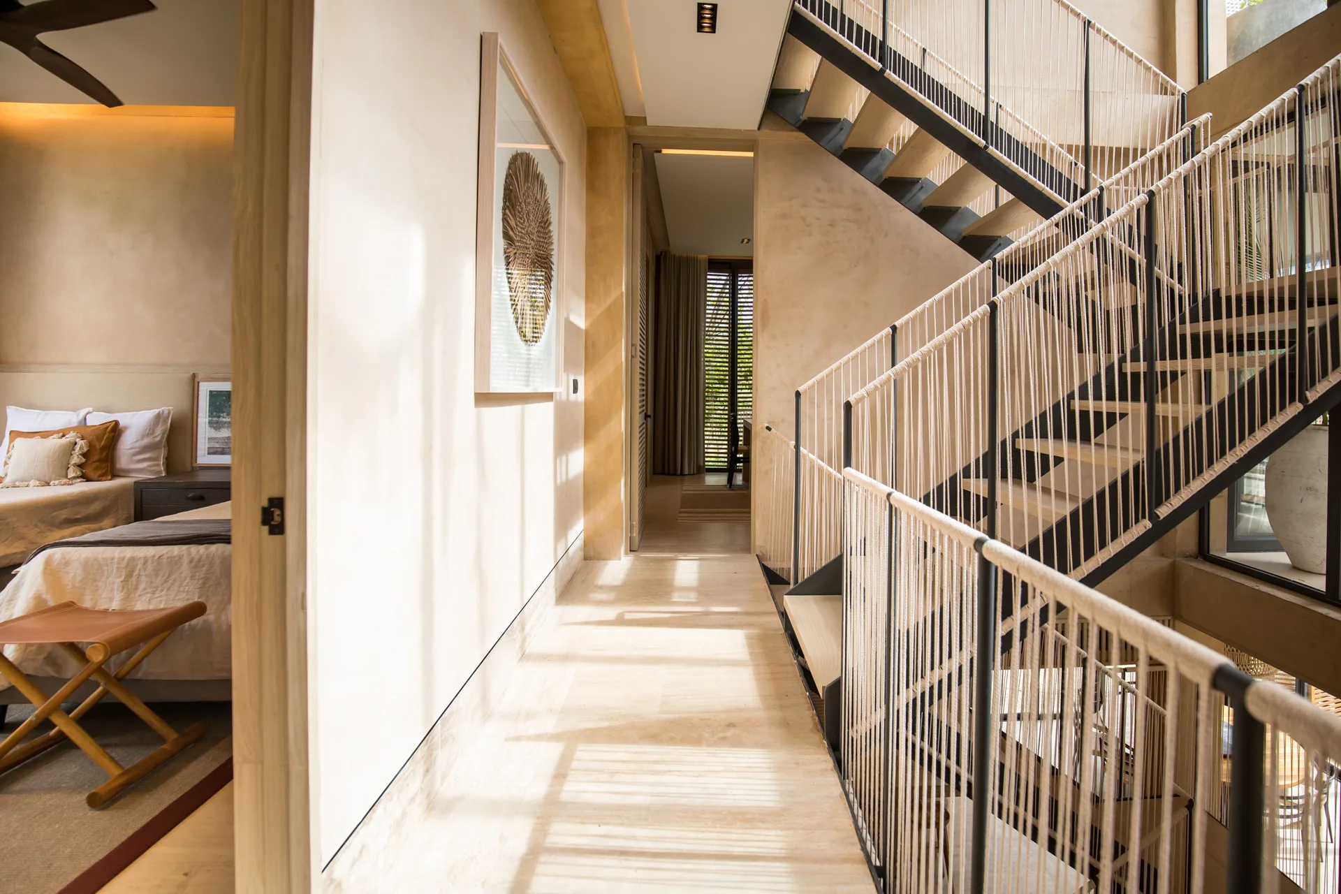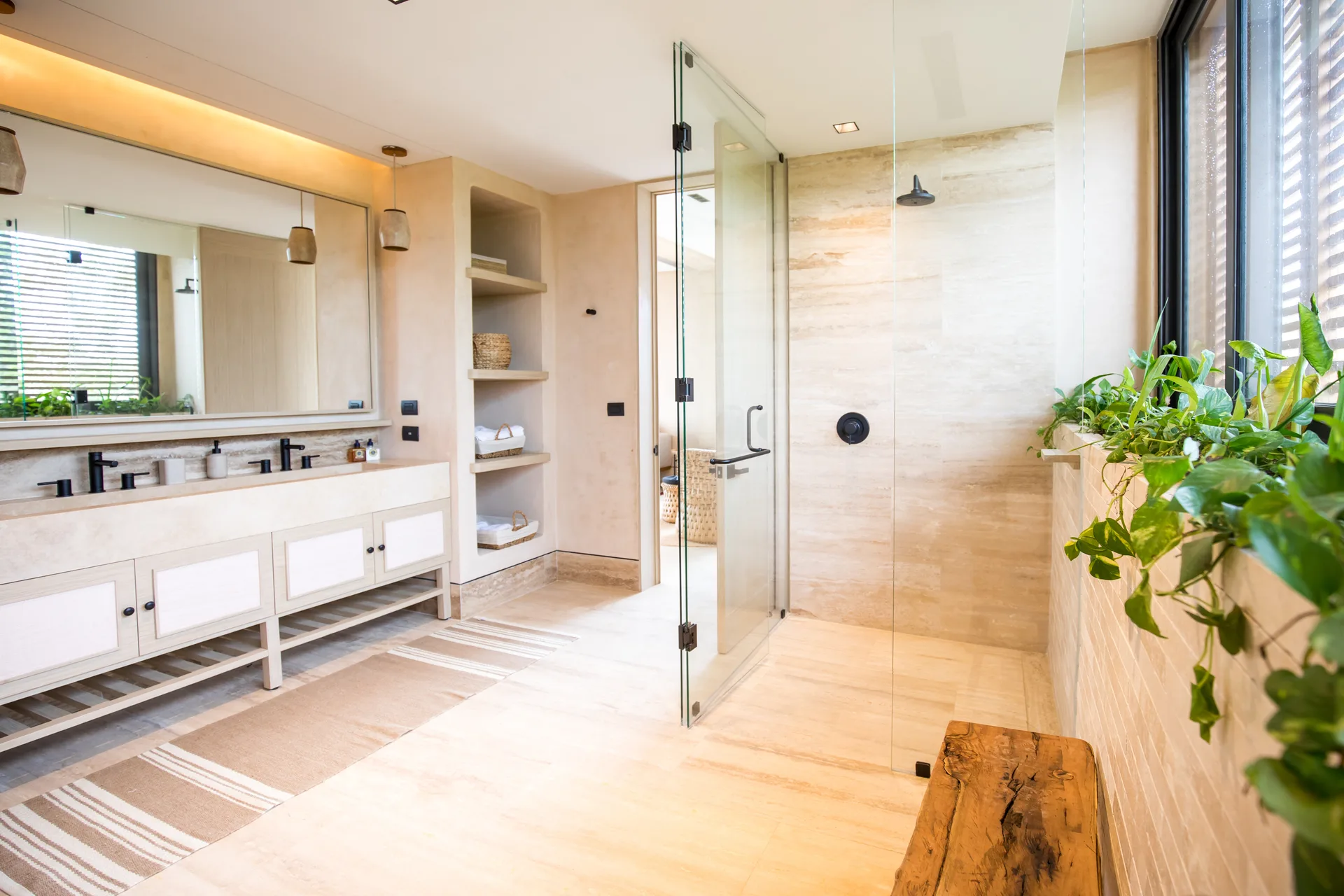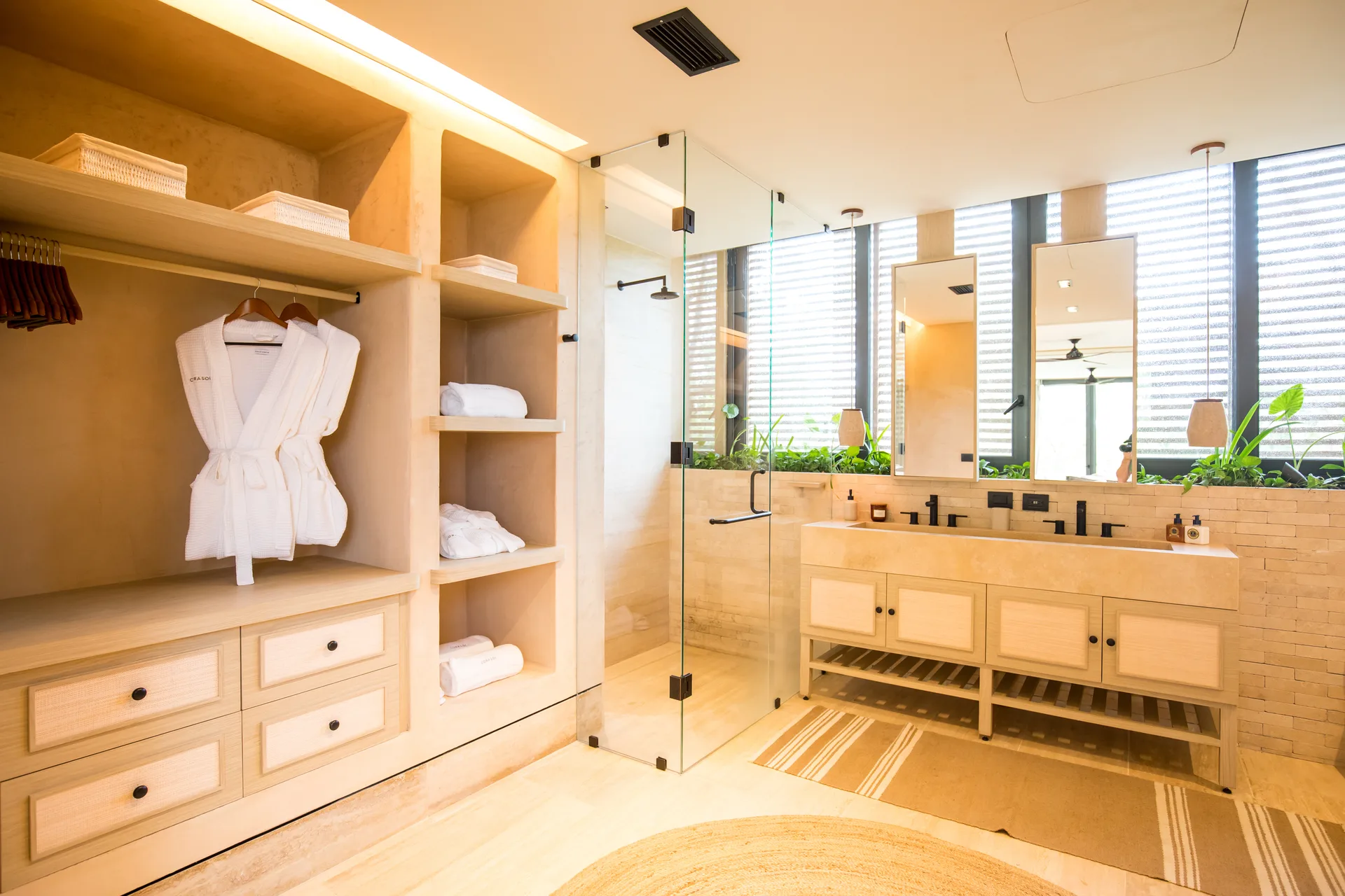 All bedroom bathrooms are designed with natural touches and feature windows and interior gardens. The family room provides access to the terrace and green views, creating a cozy space for gatherings.