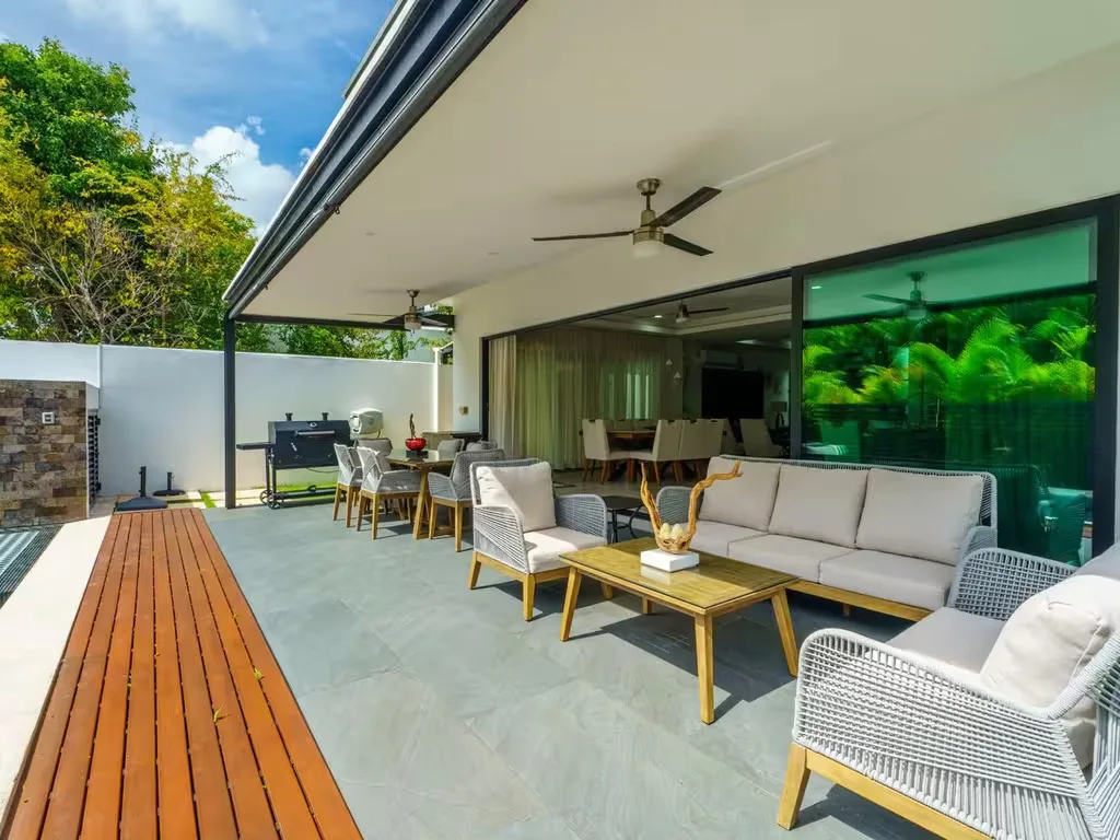The property features a construction size of 373. 4 square meters and sits on a 381. 6 square meter lot. It is a two-story home with four bedrooms and five full bathrooms. There are three parking spaces. The residence includes a private luxury swimming pool, floor-to-ceiling retractable doors that open to the pool area, and cable and internet connections. It also has a service room and a laundry room.