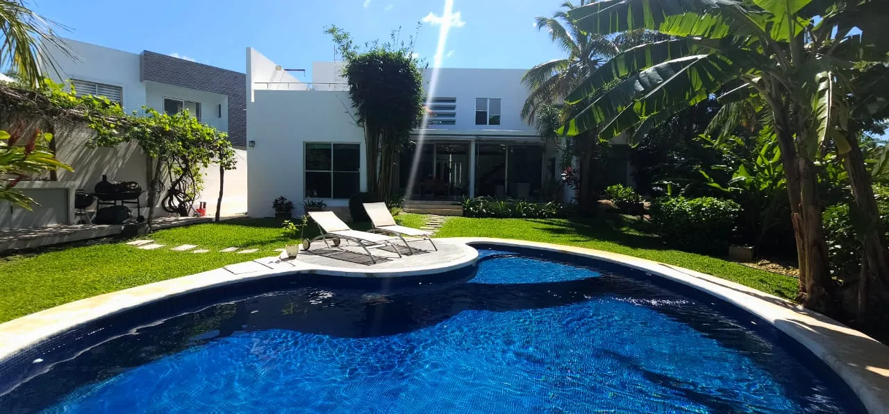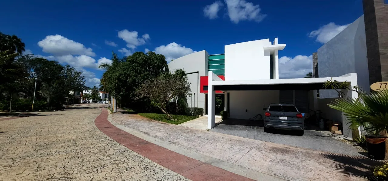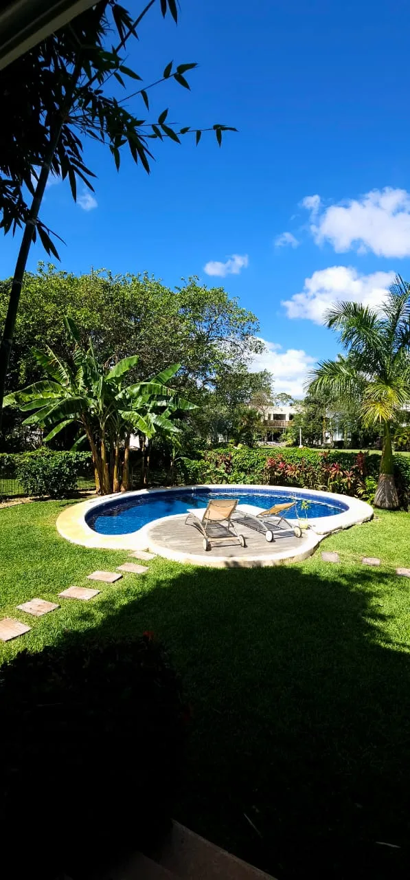 The residence includes parking for three vehicles, a private pool surrounded by lush green areas, and comprehensive 24-hour security. The maintenance ensures the property is kept in impeccable condition.