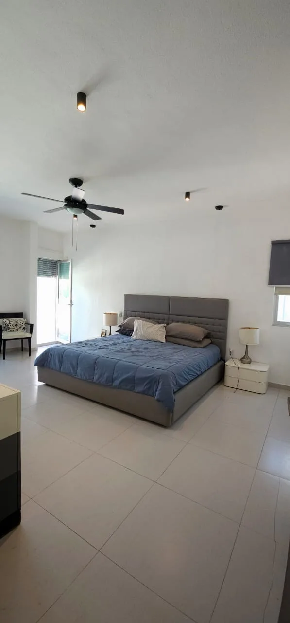 The residence features three bedrooms, each with its own en-suite bathroom, serving as private retreats. The spacious living area is adorned with carefully selected furnishings and includes air conditioning and ceiling fans for maximum comfort in every season.