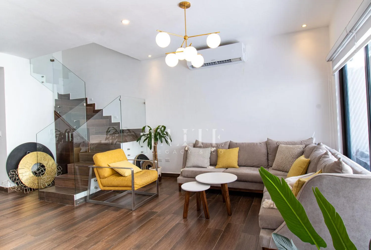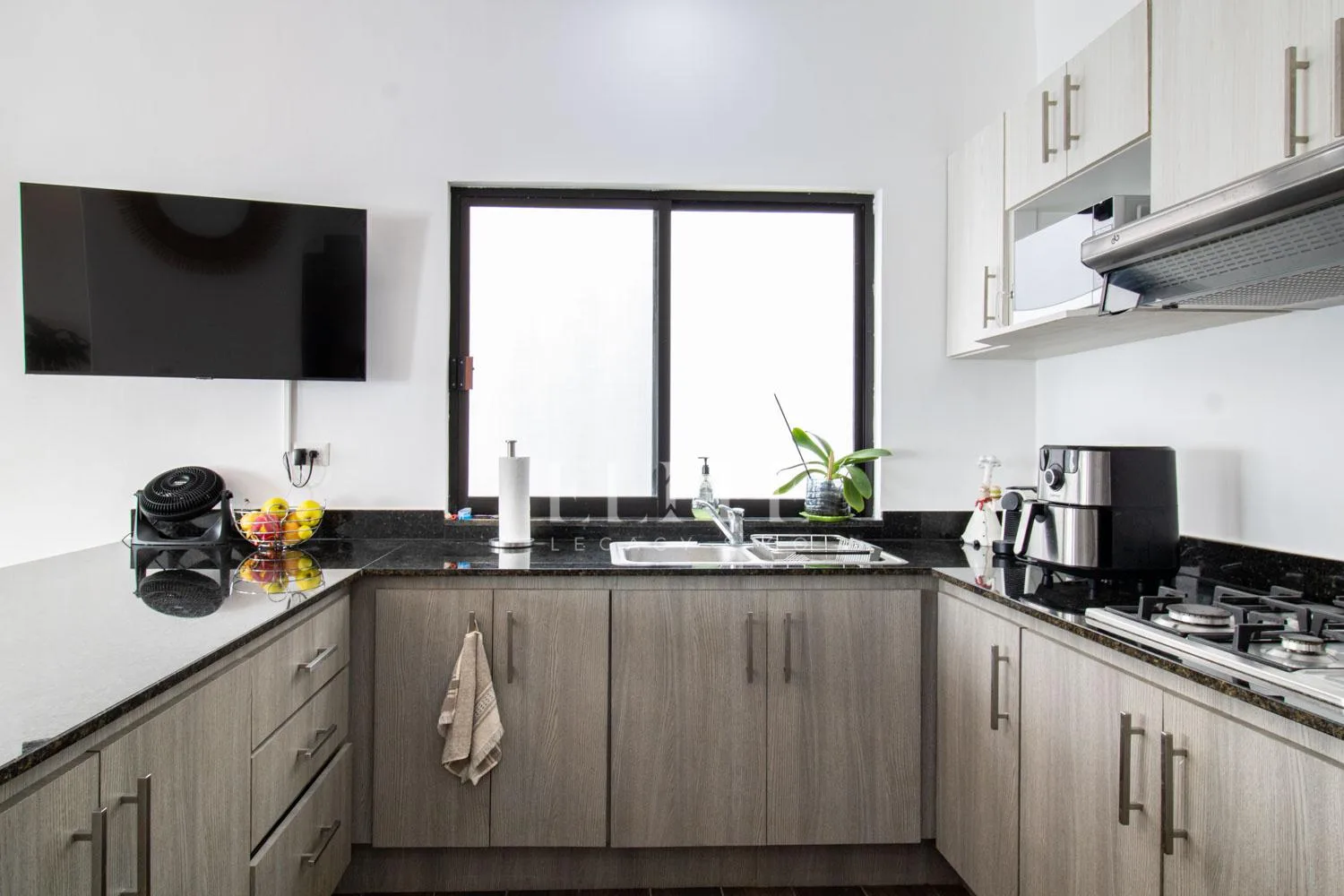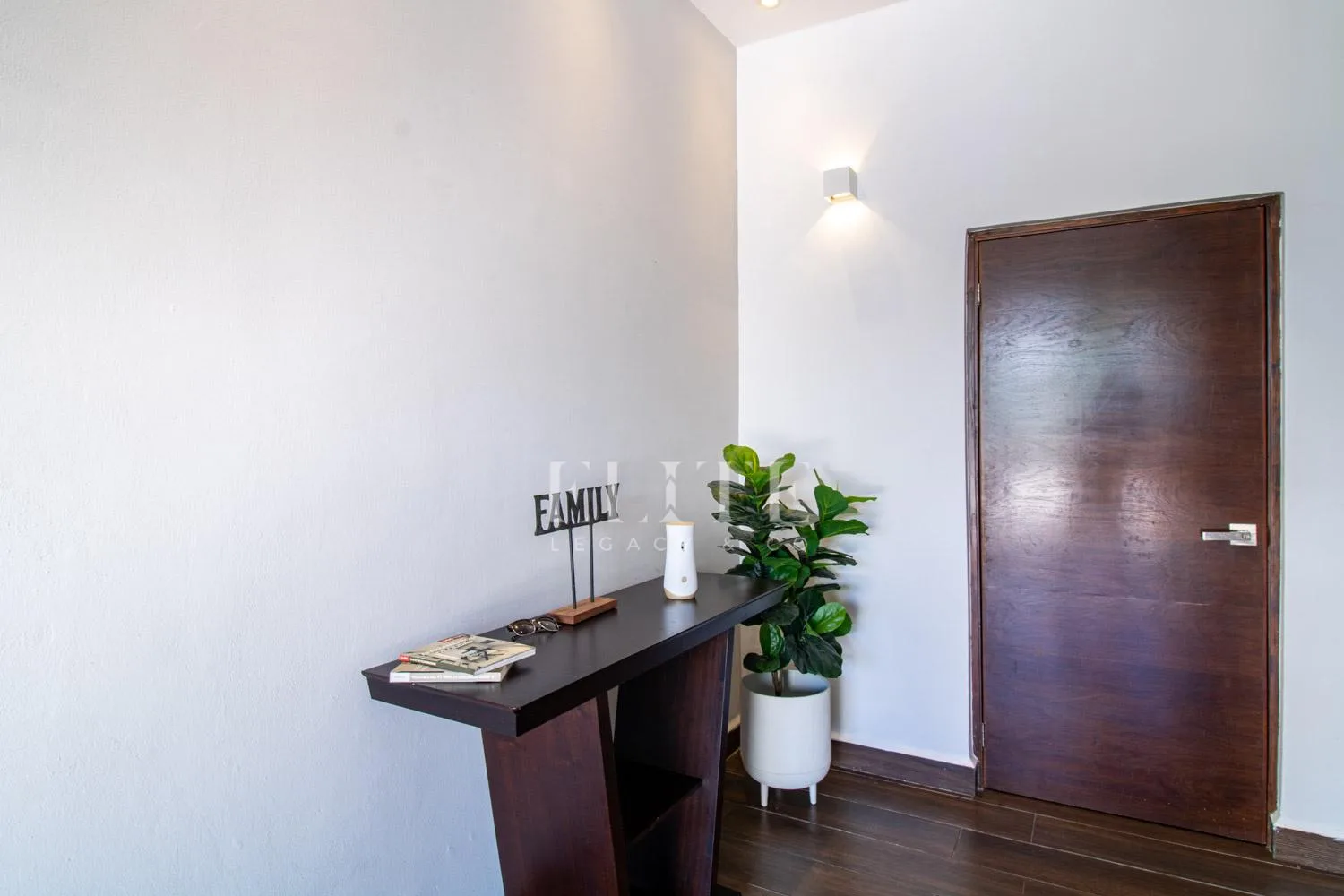 This unfurnished, spacious residence spans three levels. The first level features an open-concept living and dining area, a fully equipped integral kitchen with a granite breakfast bar, and a guest half-bath. It opens to a private pool, garden, and terrace. This level also includes a service room, laundry area, a service hallway, and two covered parking spaces.