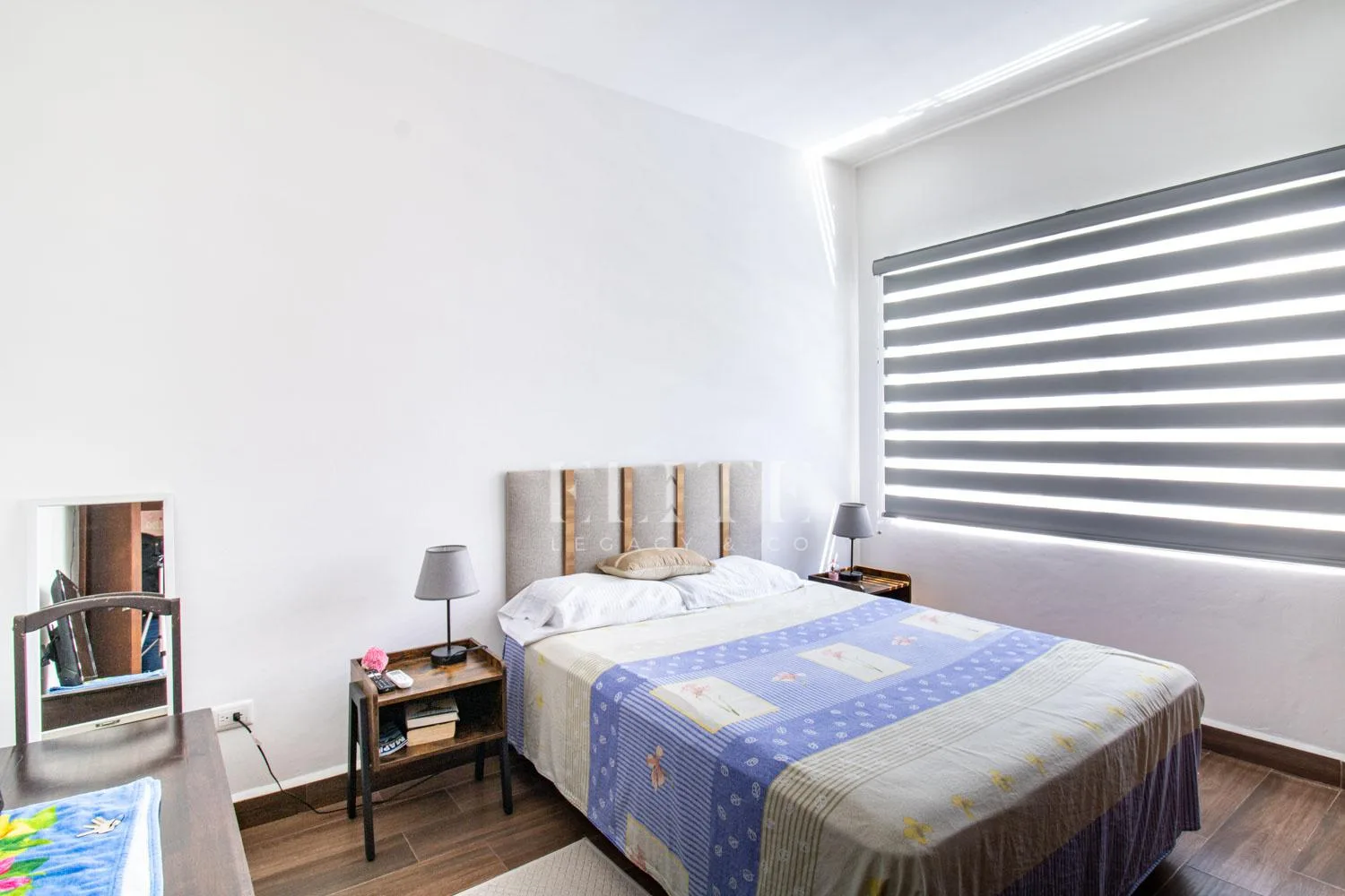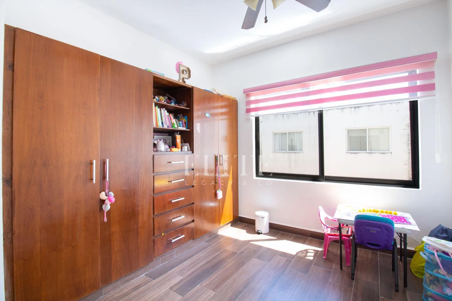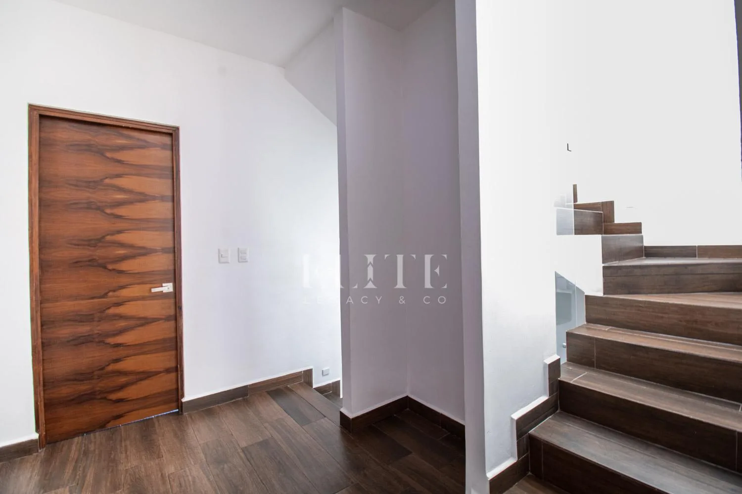 This unfurnished, spacious residence spans three levels. The first level features an open-concept living and dining area, a fully equipped integral kitchen with a granite breakfast bar, and a guest half-bath. It opens to a private pool, garden, and terrace. This level also includes a service room, laundry area, a service hallway, and two covered parking spaces.