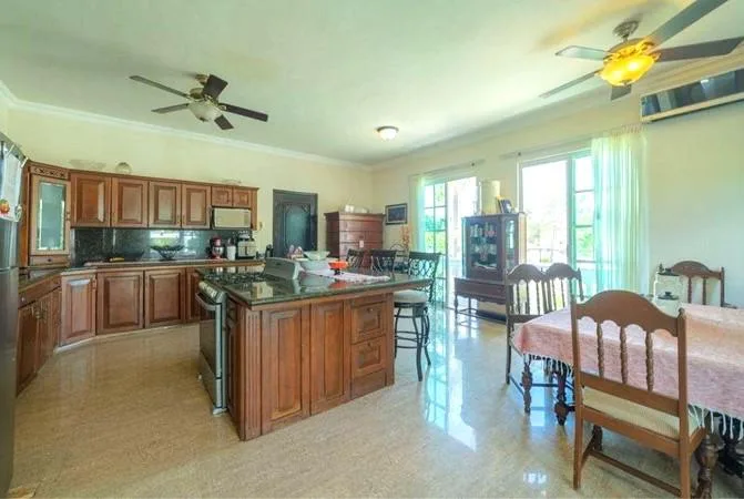 It features a spacious and bright living room with direct access to the pool and garden. The layout includes a foyer or hall, a bar, and a dining room. On the first floor, there is a bedroom with a full bathroom. The property includes a spacious kitchen equipped with a granite island, a utility room, and a laundry room. In total, there are five bedrooms with closets and four and a half bathrooms.