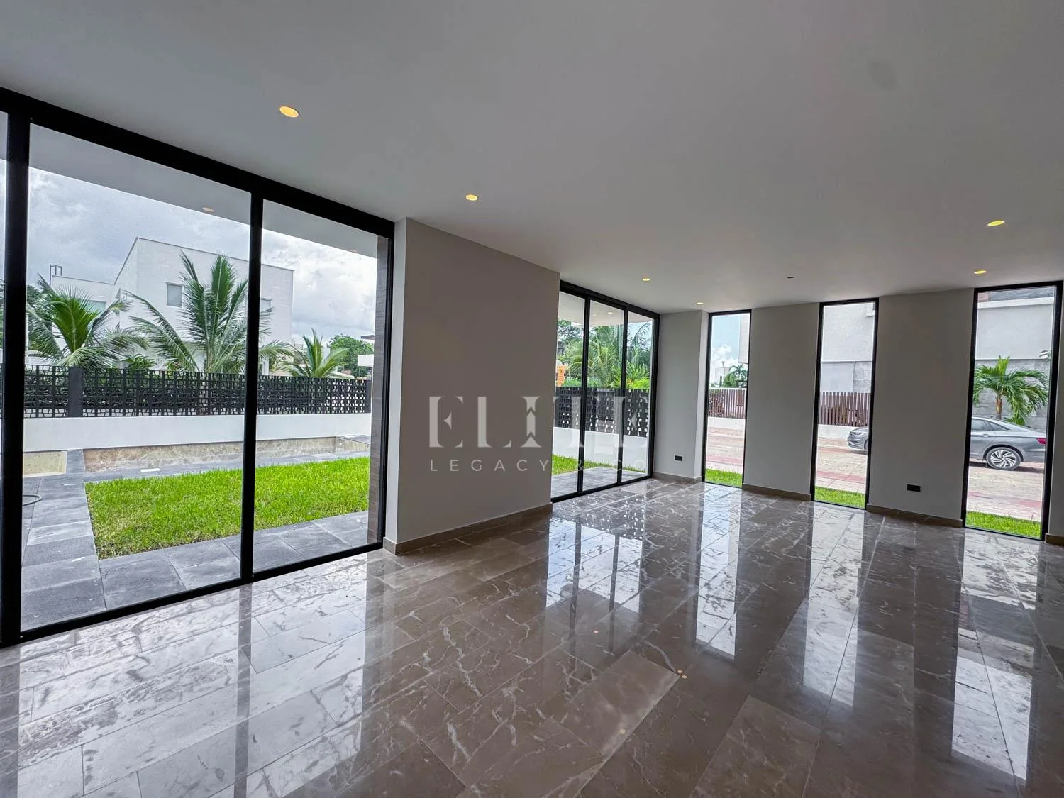 On the first level, the residence includes a living and dining room, an equipped integral kitchen, a pantry, a study with a full bathroom, a laundry room, a pool with a sunbathing area, a terrace, and covered parking for four cars.