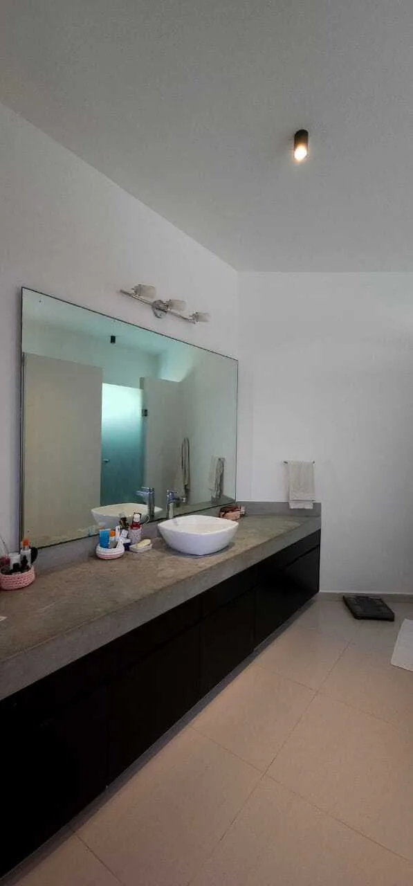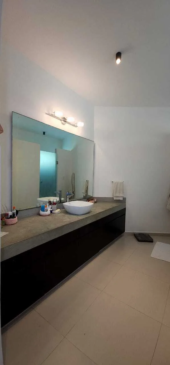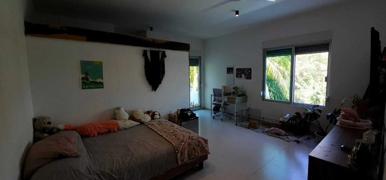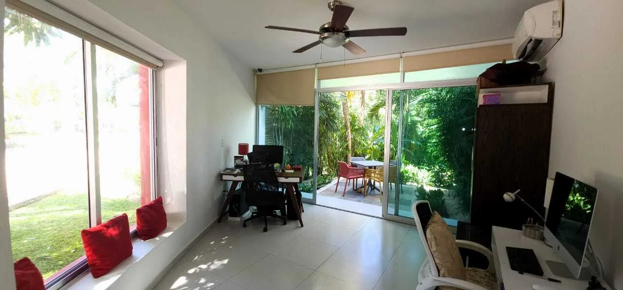 The residence includes three bedrooms, each with its own bathroom. The spacious living room is furnished and equipped with air conditioning and ceiling fans.
