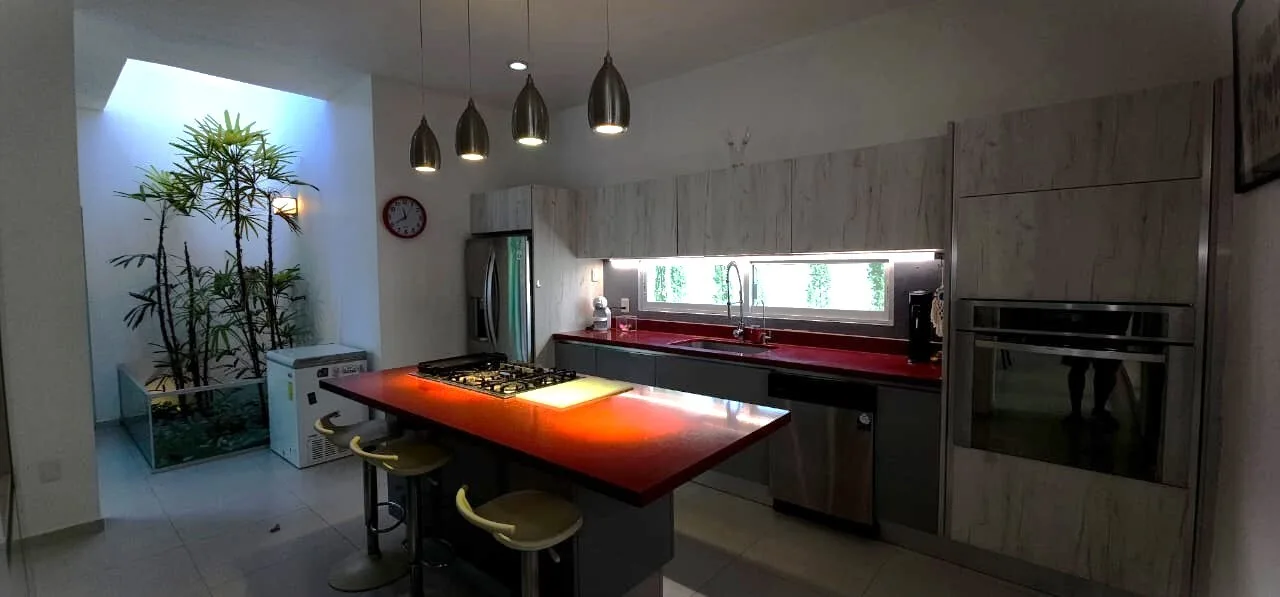 The kitchen has quality cabinetry, a central island, an oven, a microwave, a coffee machine, and a modern refrigerator.