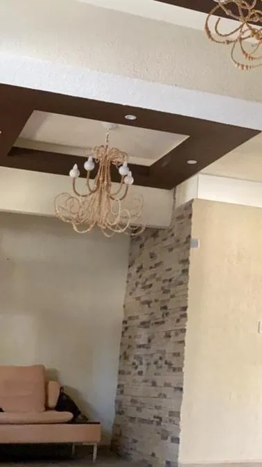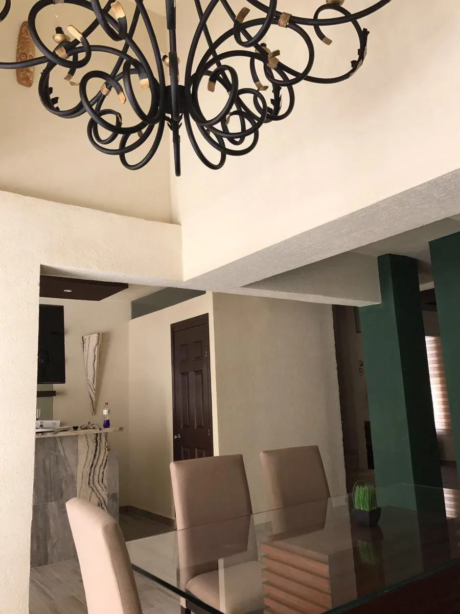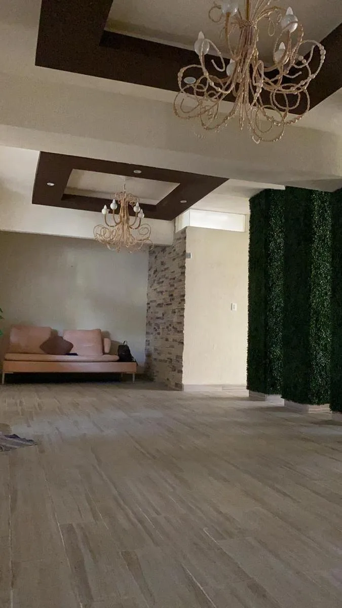 This two-story residence features ample parking, a private swimming pool with a wading pool, and a snack bar area. Inside, there is a well-distributed kitchen-dining area, a bar with an onyx counter, a spacious double-height foyer, and chandeliers. A separate laundry room with its own shower is also provided.