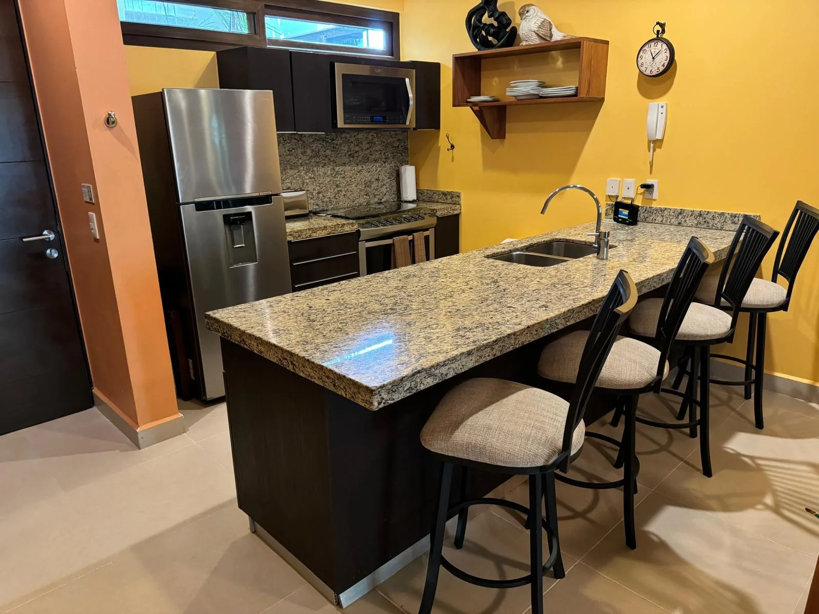 This ground-floor condo in Tao is furnished and ready for immediate occupancy. The spacious, modern residence features 2 bedrooms and 2 fully equipped bathrooms, each with ample closet space. The kitchen is well-appointed with granite countertops, a full-size stove, refrigerator, and dishwasher. A breakfast bar with integrated double sinks and a laundry room with washer and dryer are also included. Doors from the living room terrace open to a large, private terrace area. All living spaces are air-conditioned and equipped with ceiling fans. The condo is conveniently located near the security gate and just steps from the community pool.