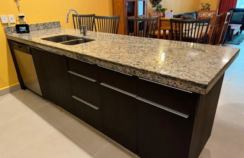 The kitchen is designed for cooking, with granite countertops, a large stove, refrigerator, and dishwasher. The condo also has a large private terrace, ideal for enjoying warm afternoons with the sea breeze or for entertaining guests in a comfortable and exclusive atmosphere.