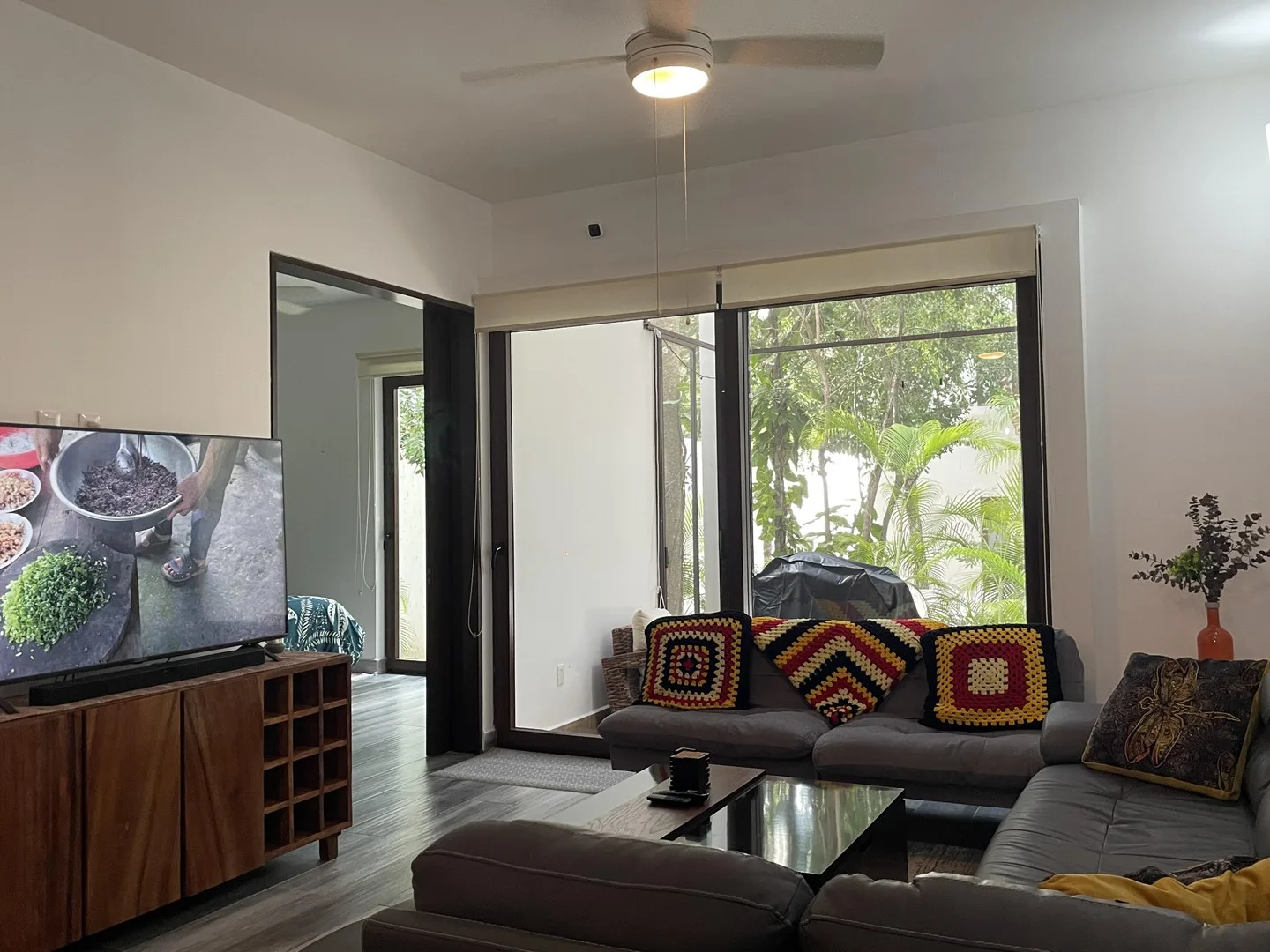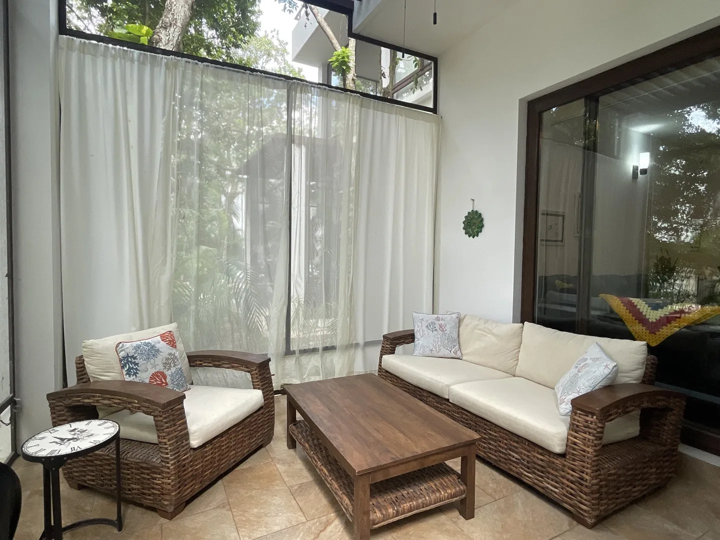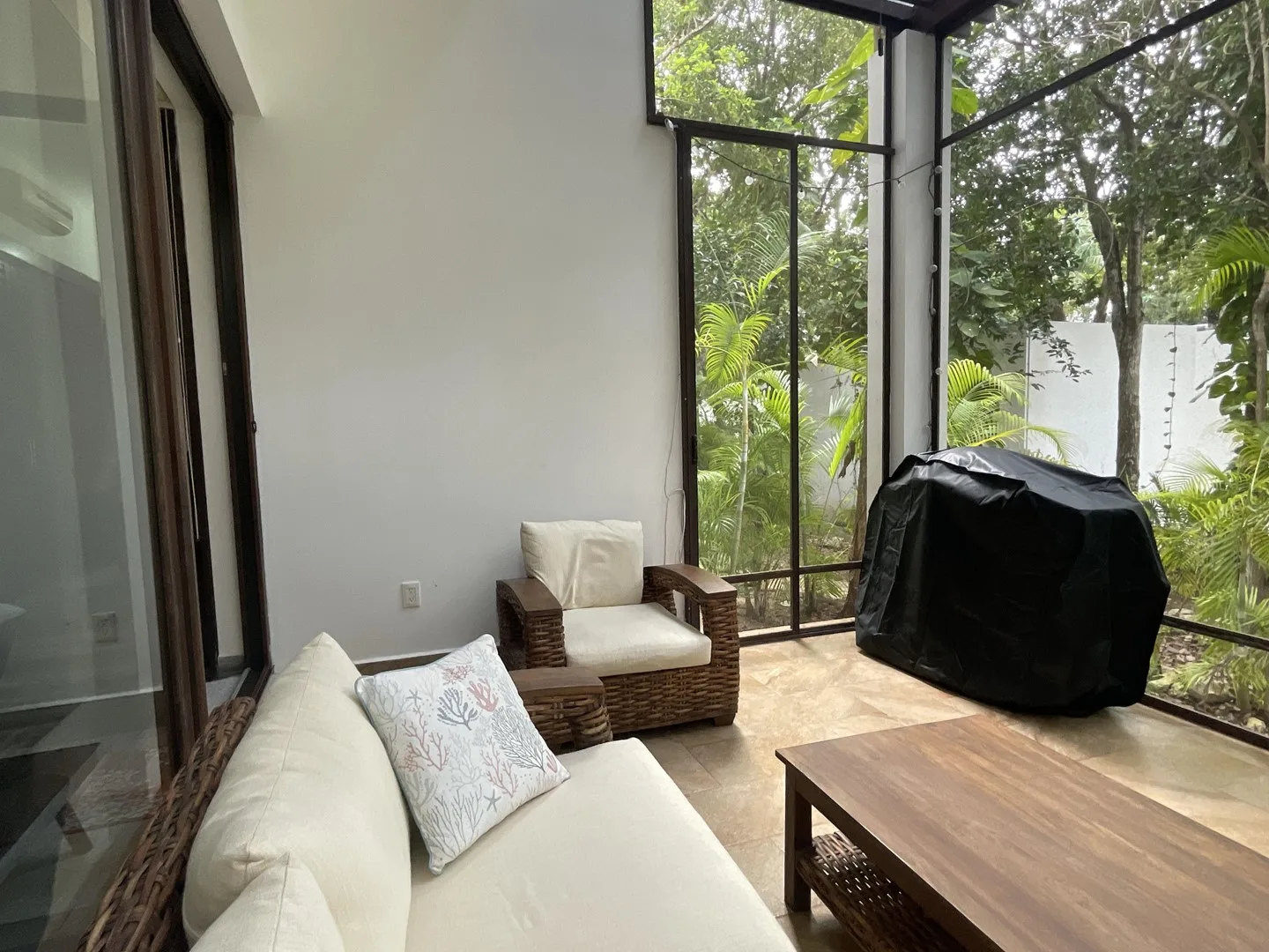 The living space extends to a covered terrace that opens to lush greenery, creating an ideal area for relaxation, dining, or enjoying morning coffee surrounded by nature. The property has never been rented and is in pristine condition throughout.