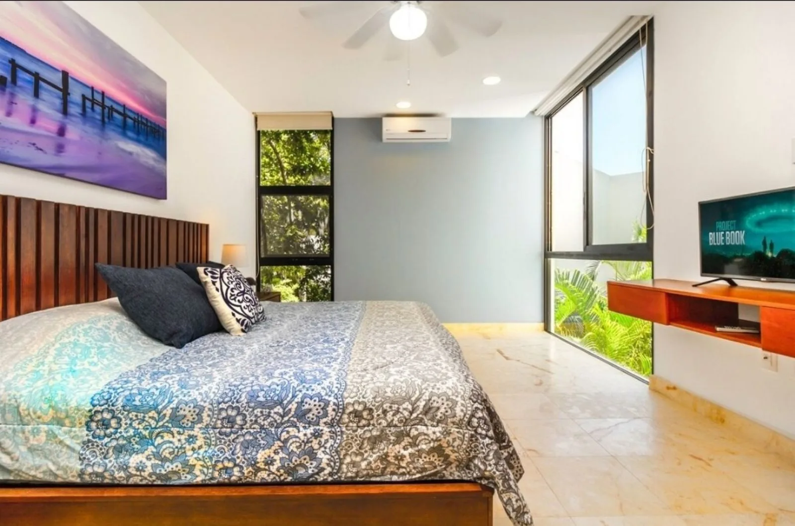 The apartment features a luxurious Mexican style filled with natural light. It includes one bedroom with a king-size bed, a closet, and a Smart TV. There is one bathroom, a spacious kitchen with an island, a combined living and dining area, and a spacious terrace.