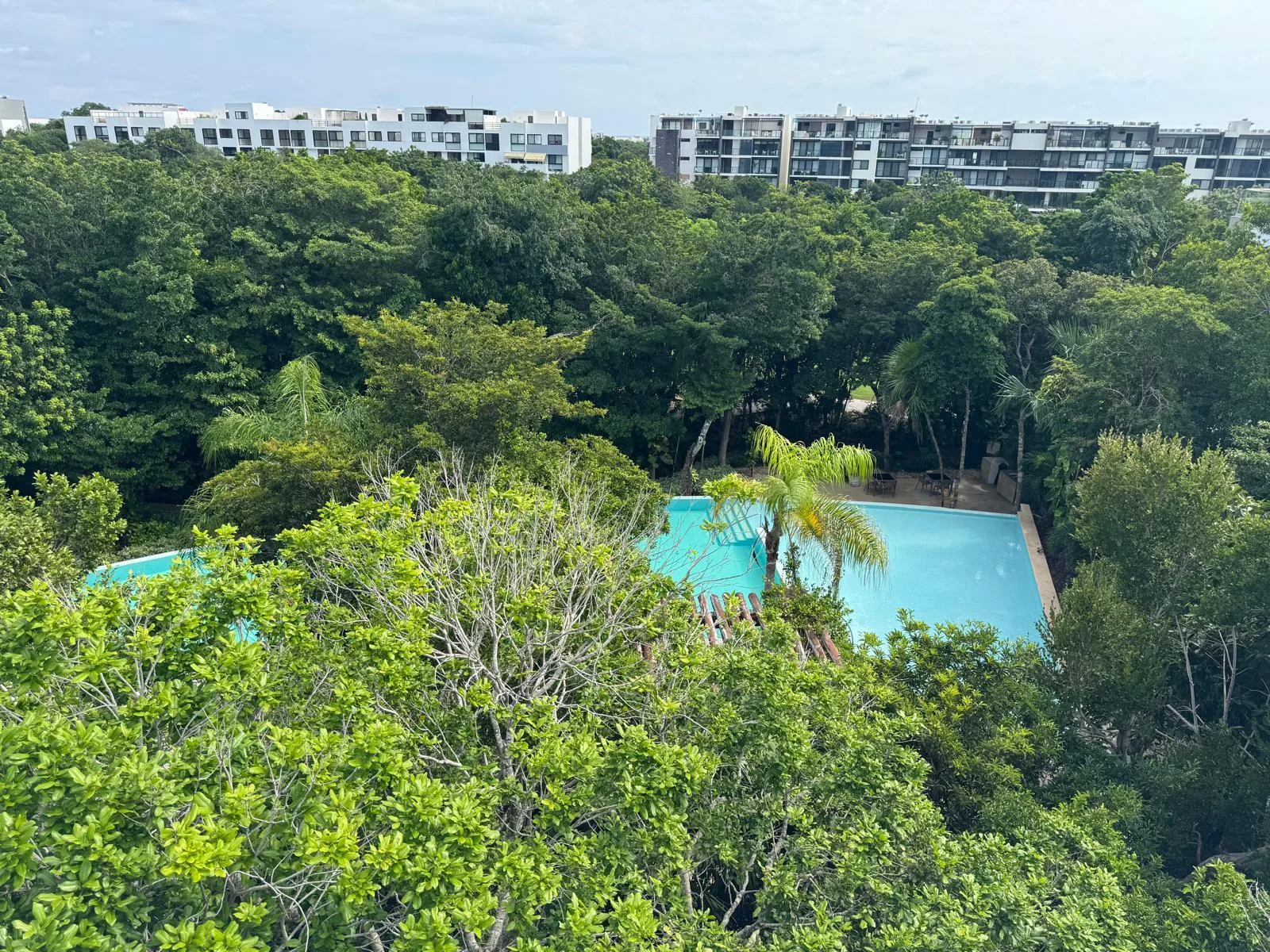 The building includes elevator access. The community features two infinity pools and a wellness center with spa services, a fully equipped gym, a yoga studio, and a conference center. The property also includes a Temazcal. A bistro serves breakfast, lunch, and dinner. Residents have access to the adjacent PGA golf course.
