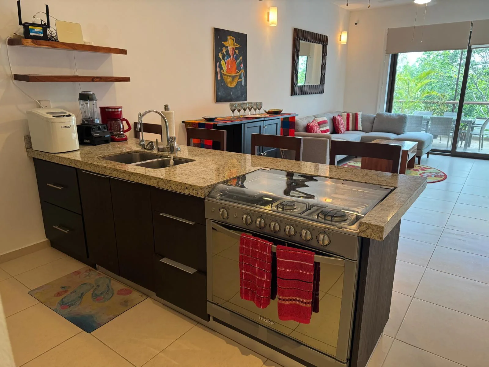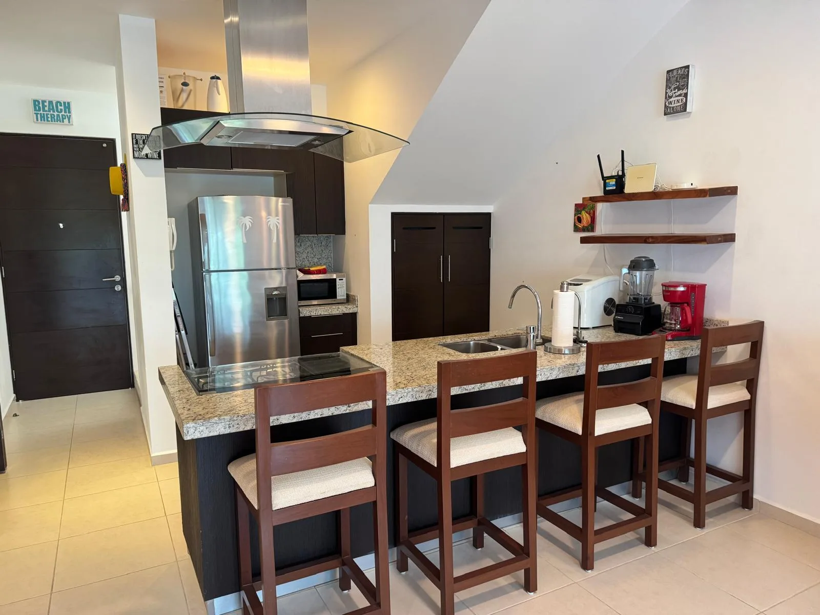 This spacious, fully furnished two-bedroom, two-bathroom penthouse is located in the TAO community within Bahia Principe. The contemporary residence features an open-concept layout with a well-appointed kitchen complete with granite countertops, a full-size gas stove, a refrigerator, and a breakfast bar. Additional upgrades include nine solar panels, an on-demand water heater, a reverse osmosis system in the kitchen, and a full-house water filtration system. A dedicated laundry area with a washer and dryer is provided.