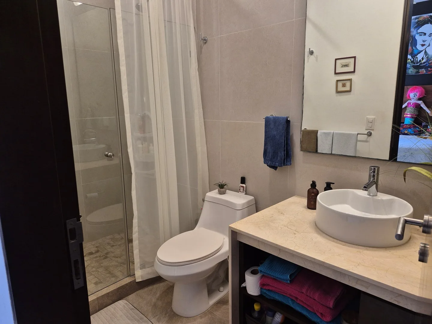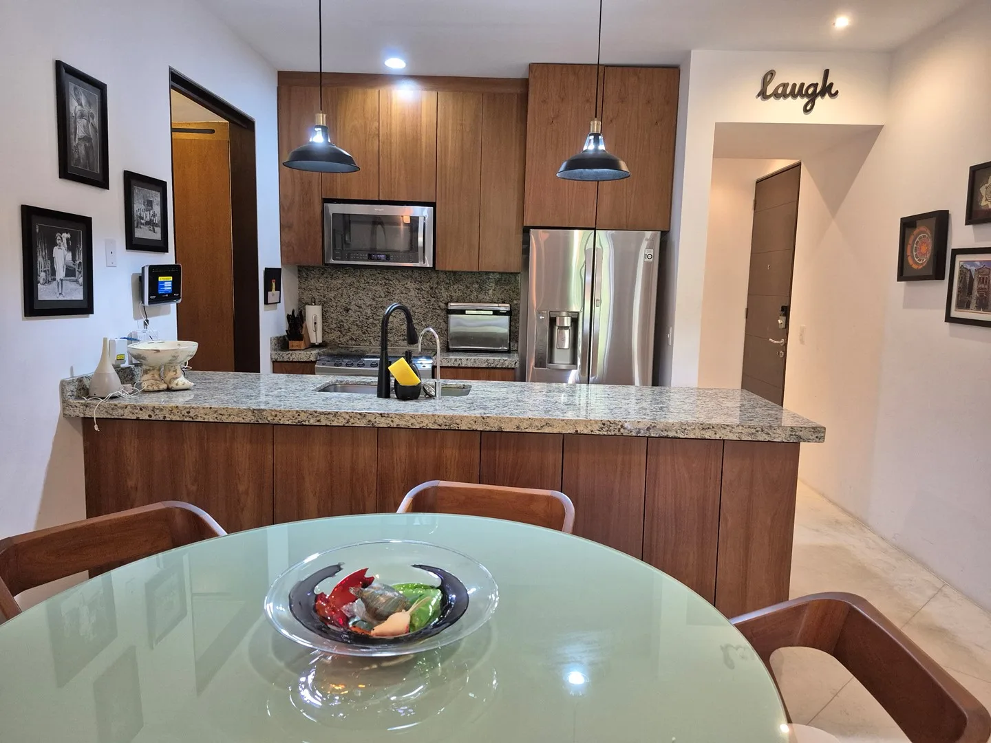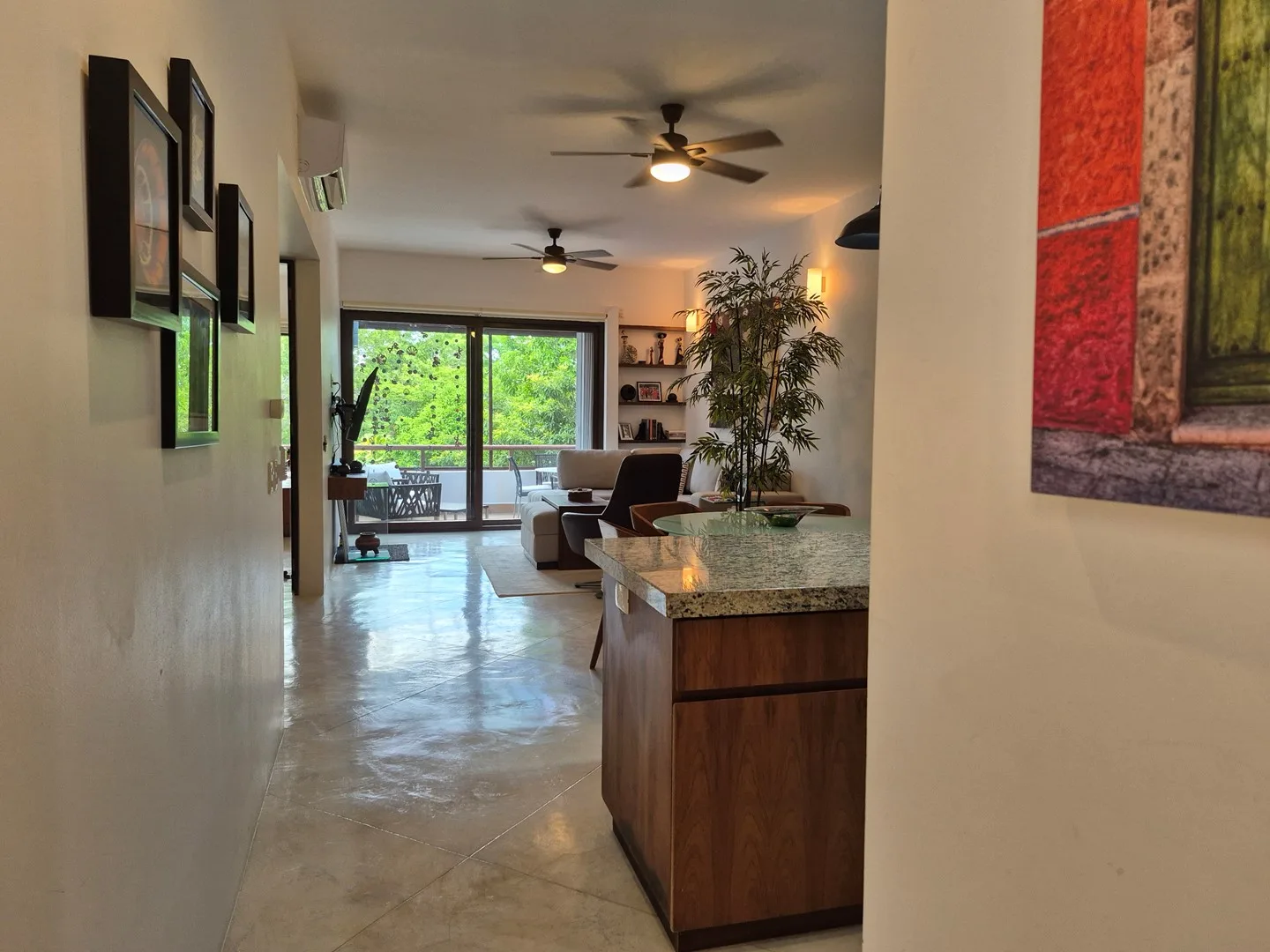 This desirable corner unit enjoys abundant natural light and enhanced privacy, with thoughtful additions including hurricane-rated blinds and front-loading LG washer and dryer. The open-plan living area, adorned with playful art, seamlessly extends to a private terrace, creating a pleasant space for relaxation or outdoor entertaining. The property also includes a terrace with a safety net and a spacious rooftop terrace with storage, ideal for full-time living or vacation rental.