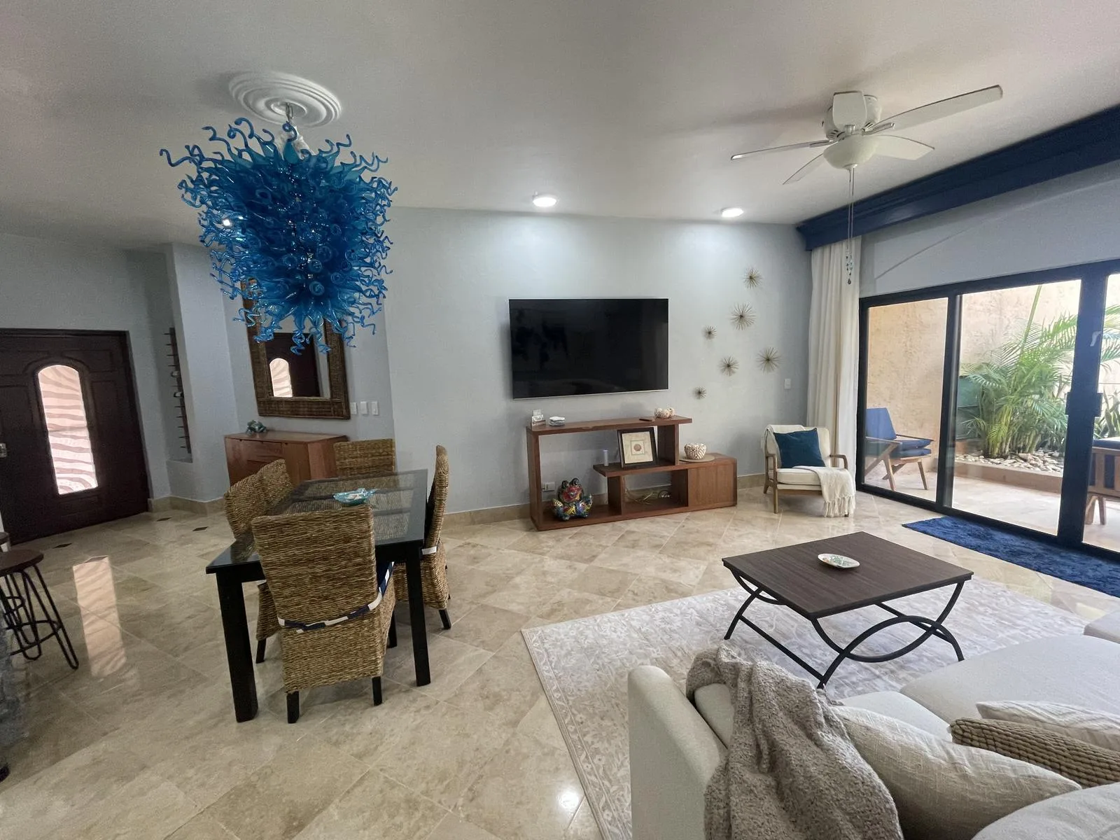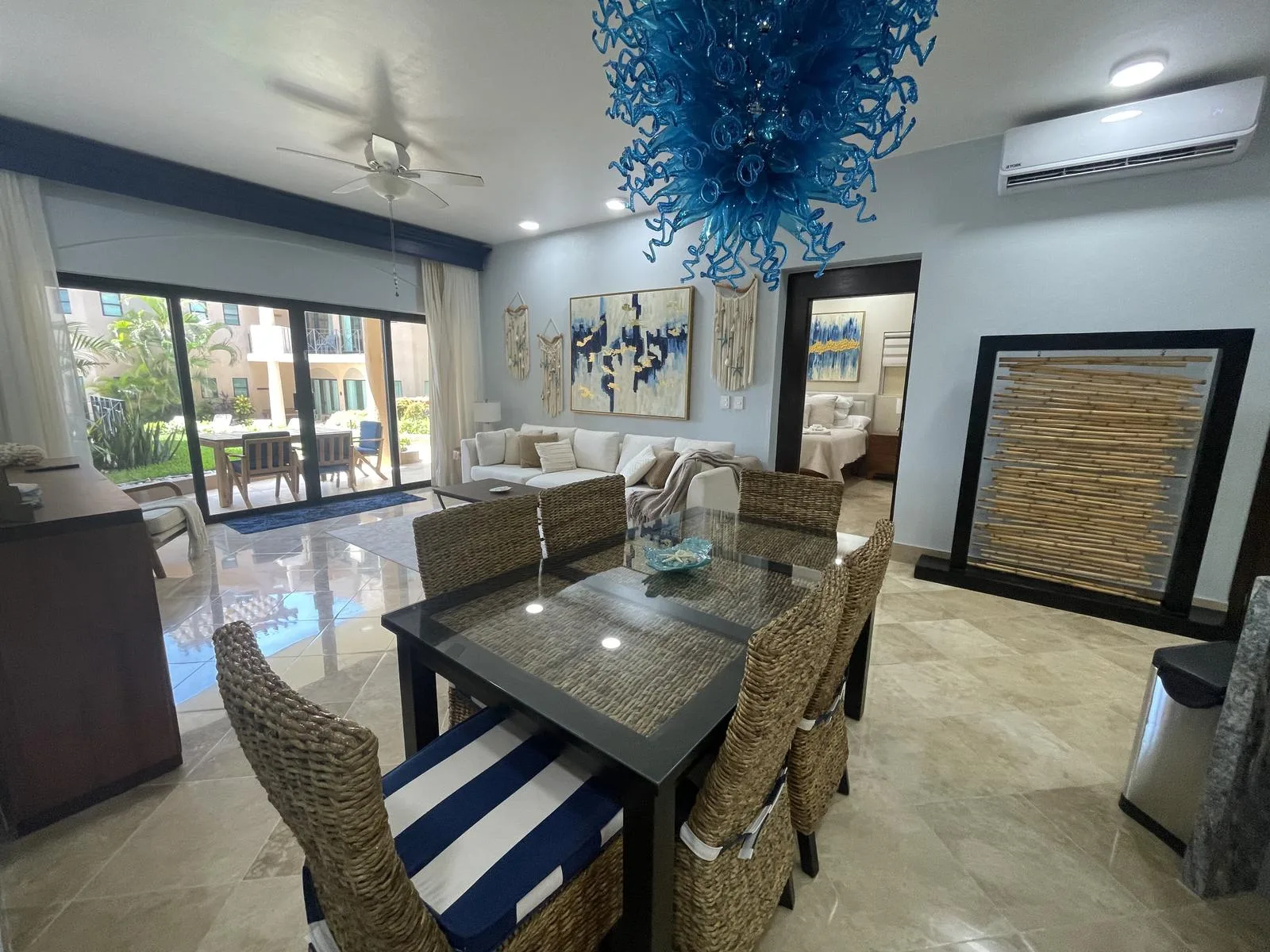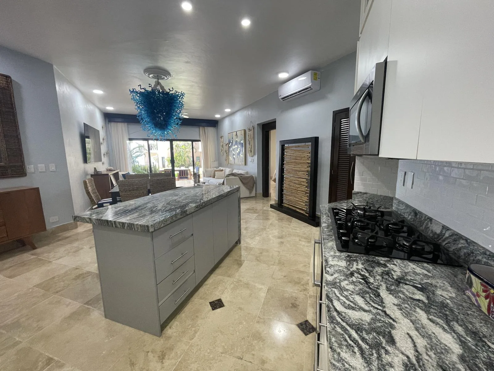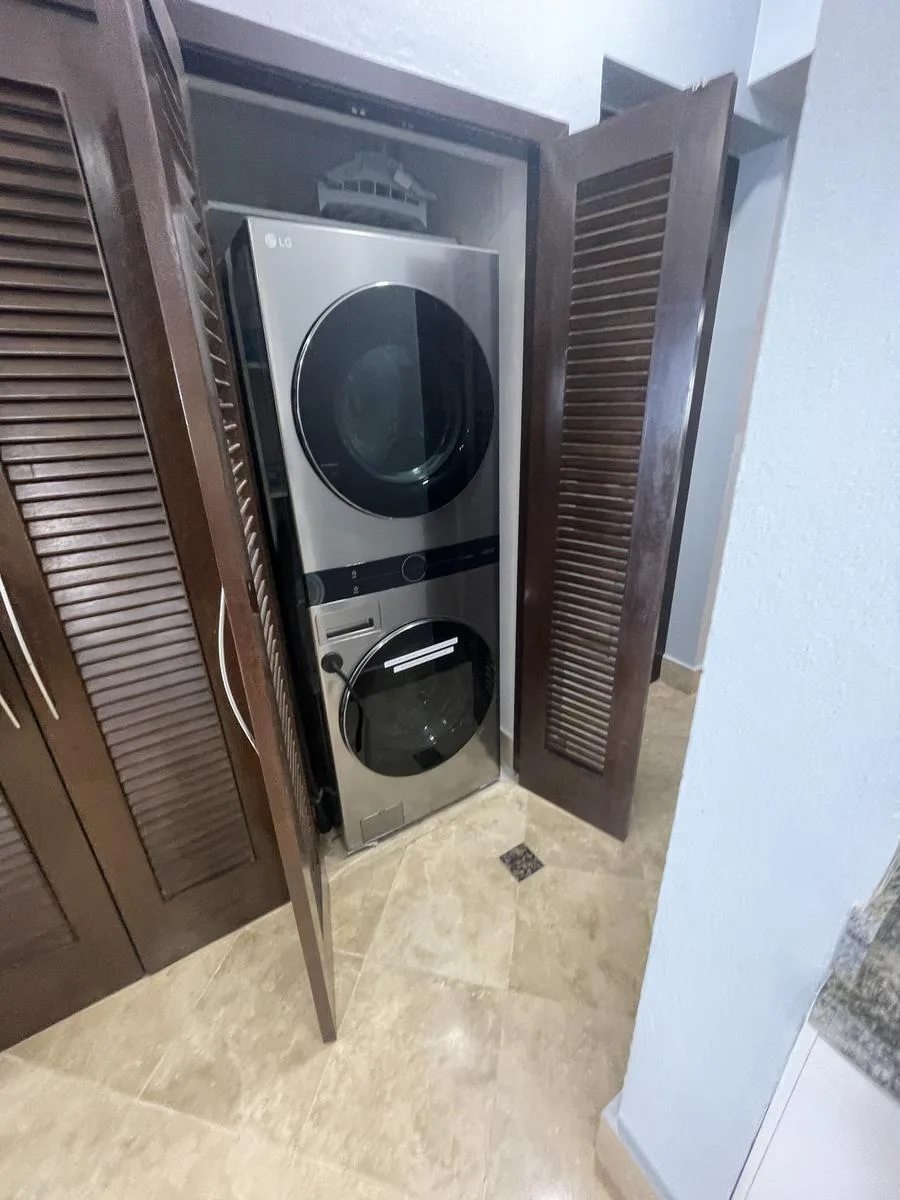 The unit was fully renovated in 2021 with high-end finishes and upgrades designed for luxury, functionality, and durability. Notable features include custom LED lighting, soft-close cabinets and drawers, high-efficiency cyclone-resistant doors and windows, an integrated water softener and instant hot water heater, marble flooring throughout, cyclone-resistant curtains, granite countertops, air conditioning in all areas, and a purified water system connected to the refrigerator for filtered ice. The property also includes a spacious laundry room with an LG washer and dryer, custom curtains, blinds, and frames, and a vanishing glass door in the primary bedroom. The gourmet kitchen features custom cabinets and a five-burner gas stove.