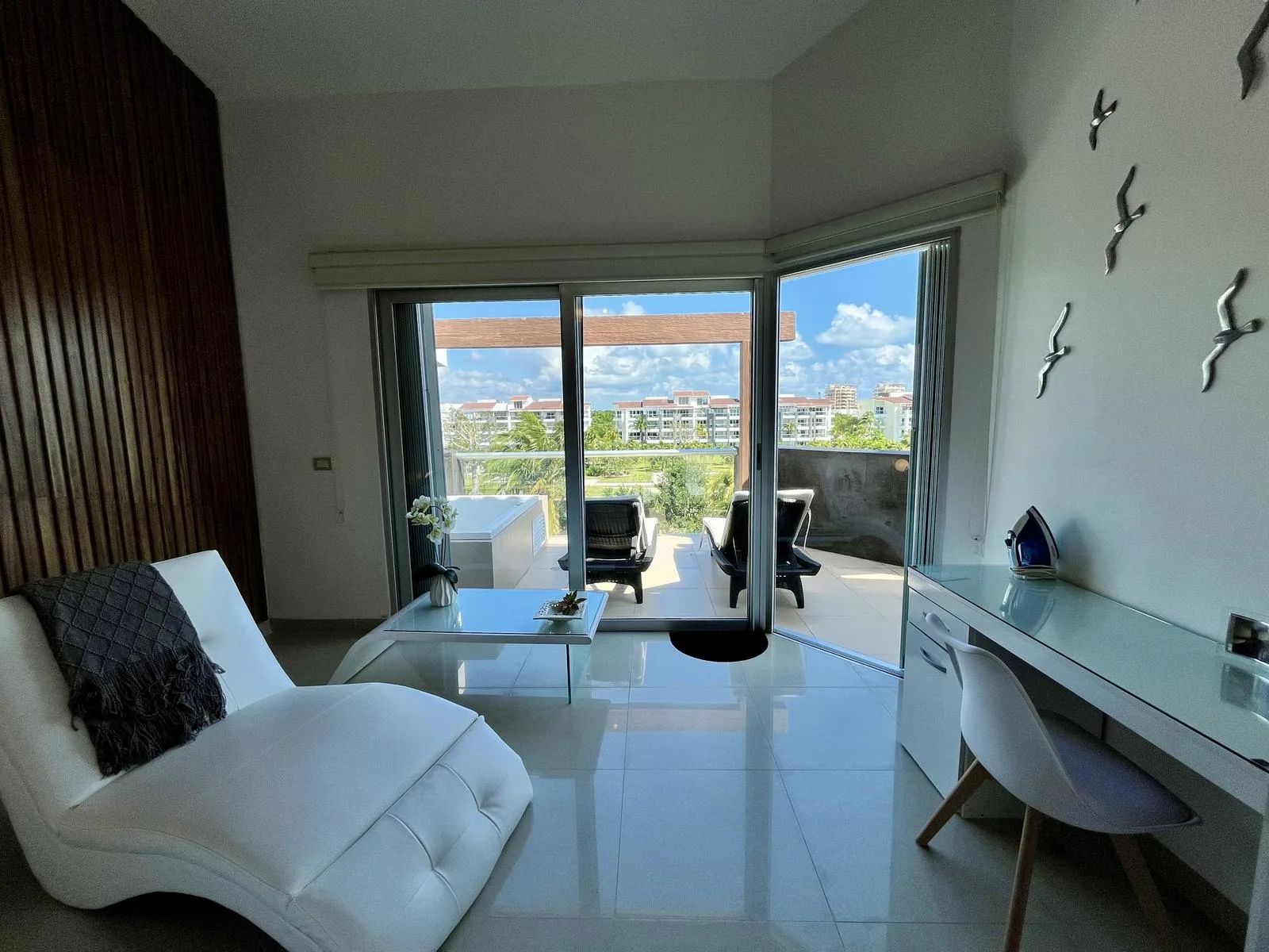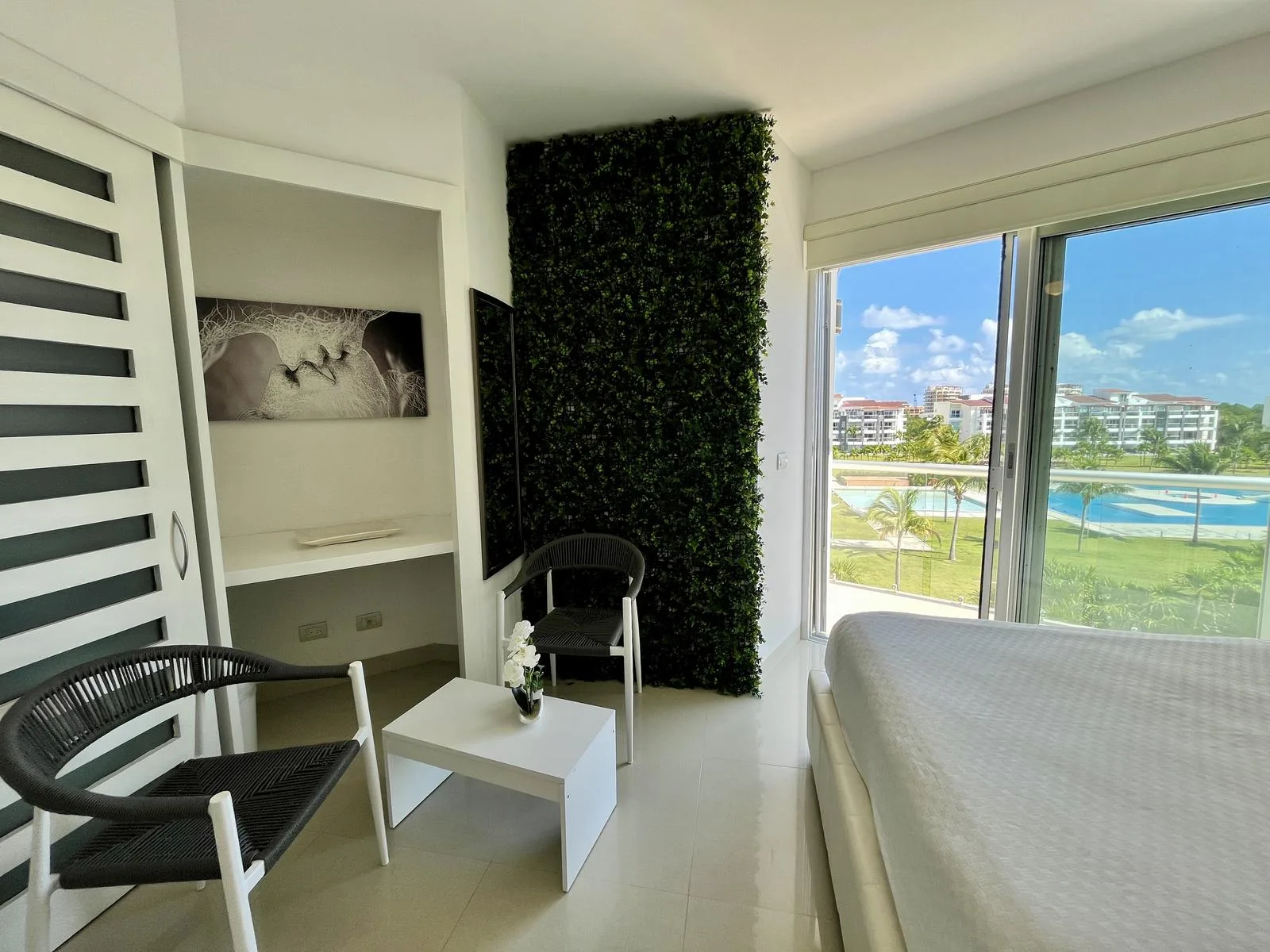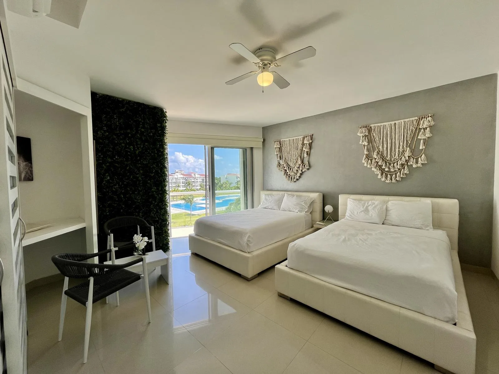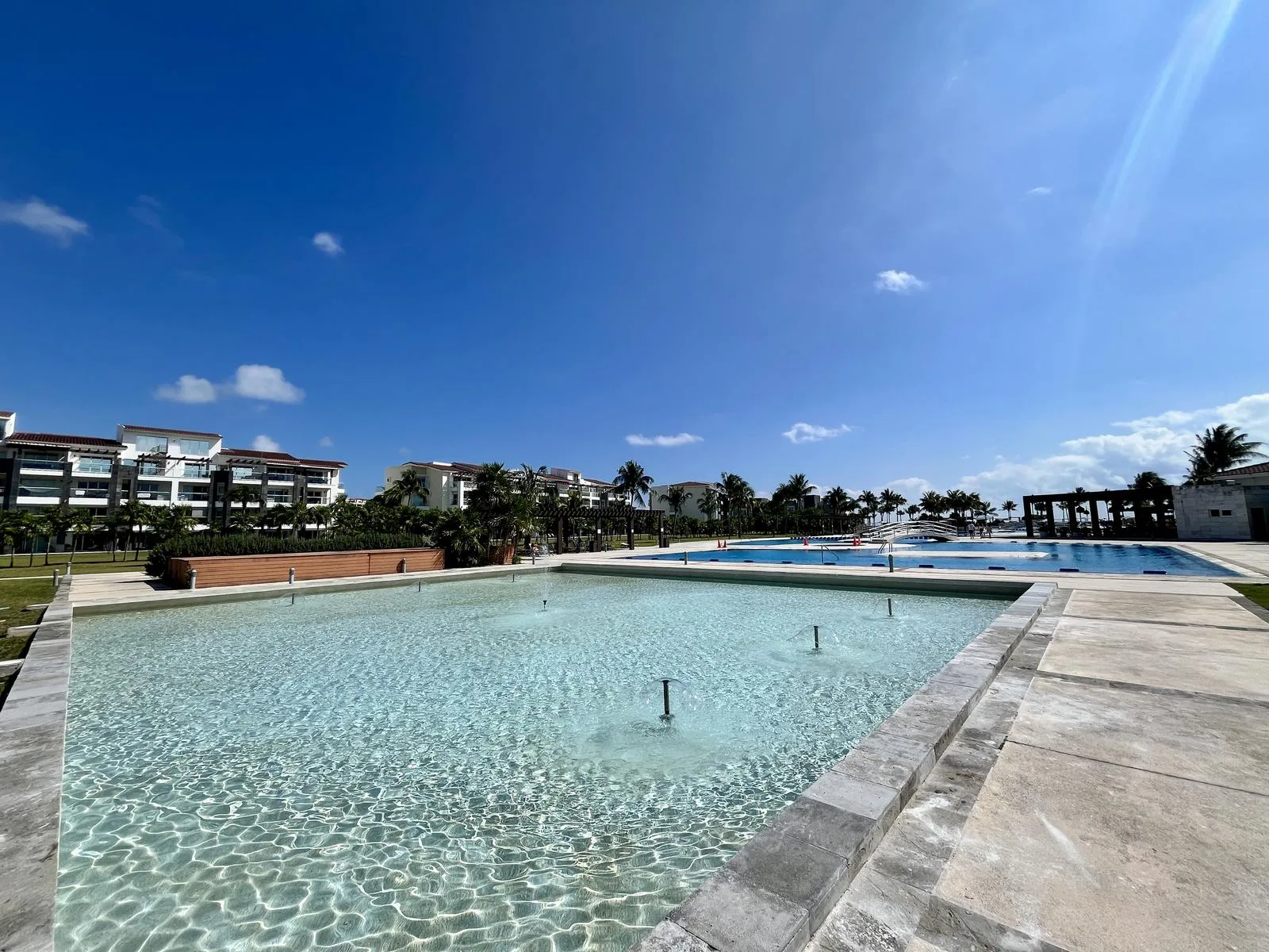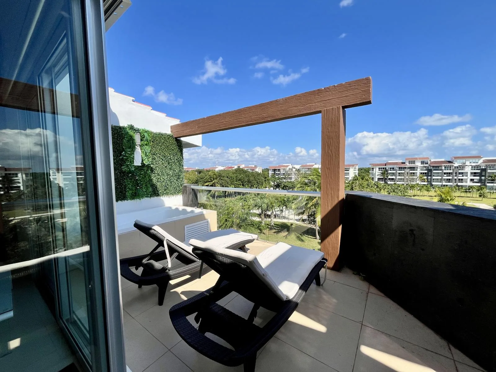 The residence provides direct beach access. On-site amenities include resort-style swimming pools, a fully equipped fitness center, lush green areas, and tropical gardens.