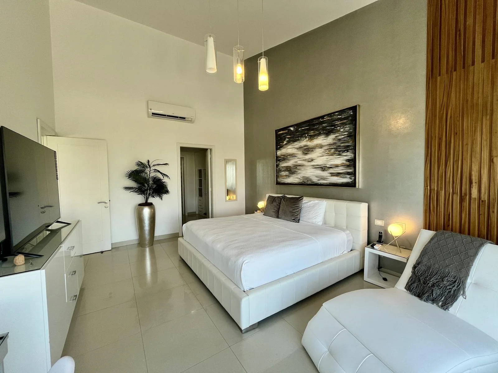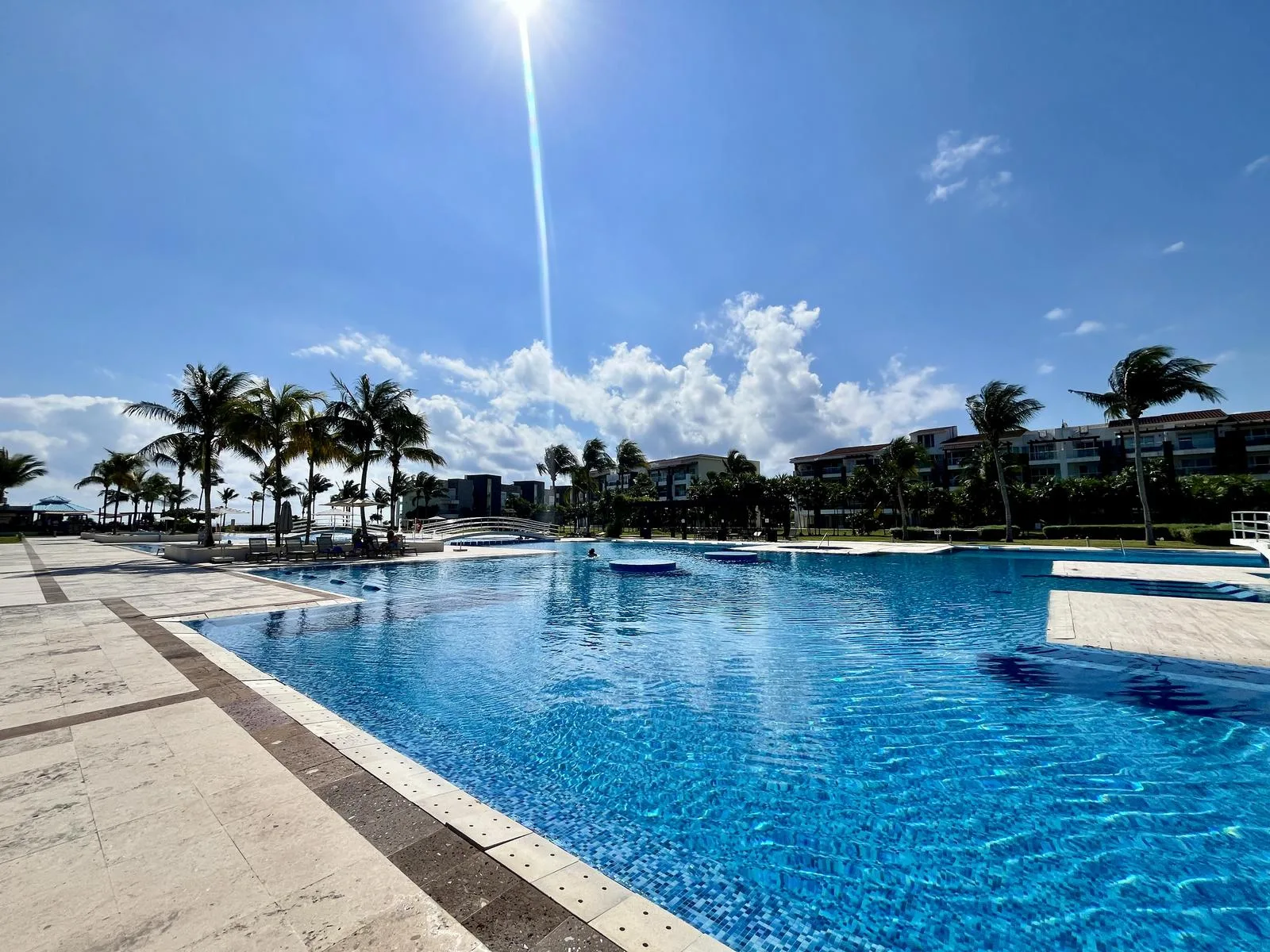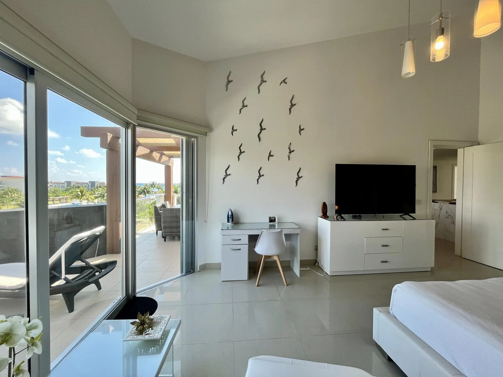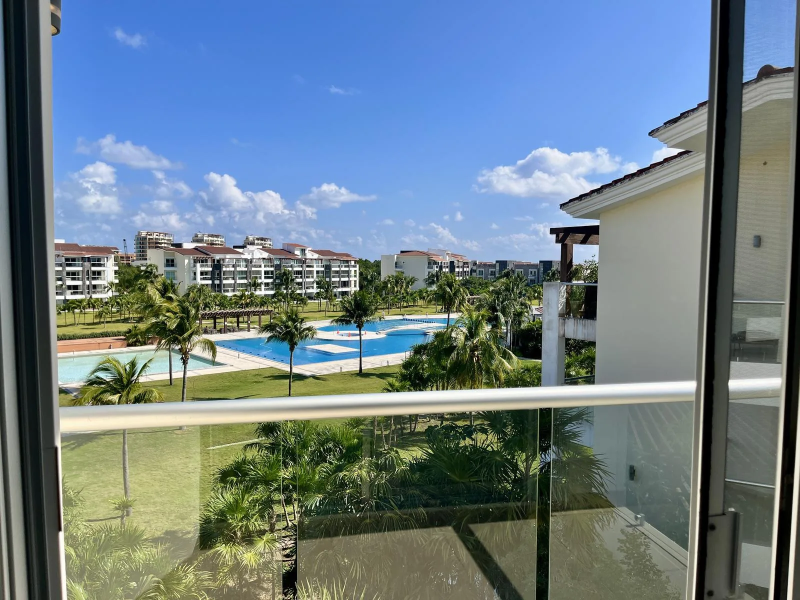 The residence provides direct beach access. On-site amenities include resort-style swimming pools, a fully equipped fitness center, lush green areas, and tropical gardens.