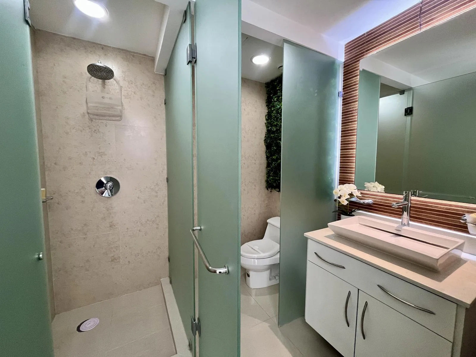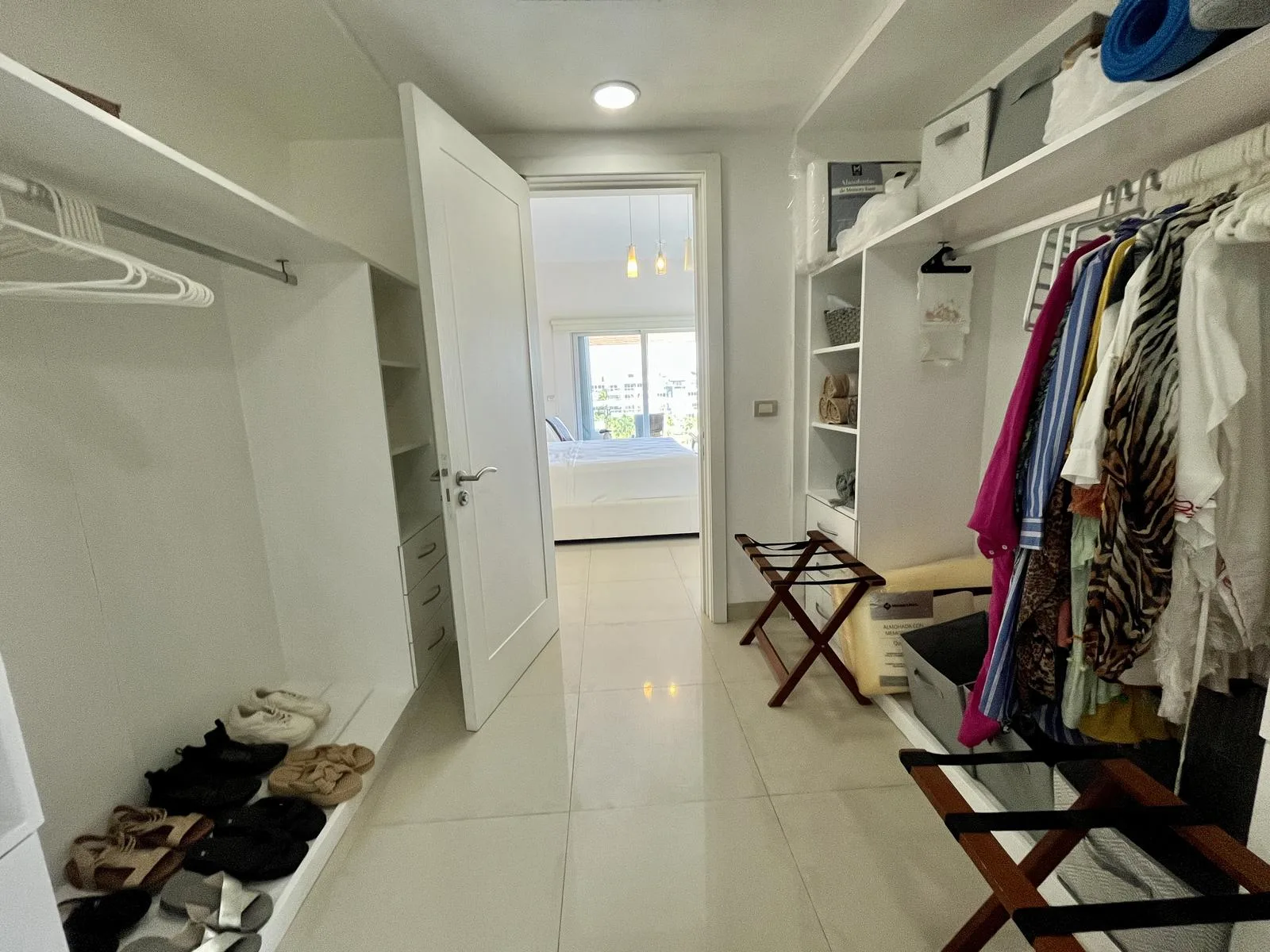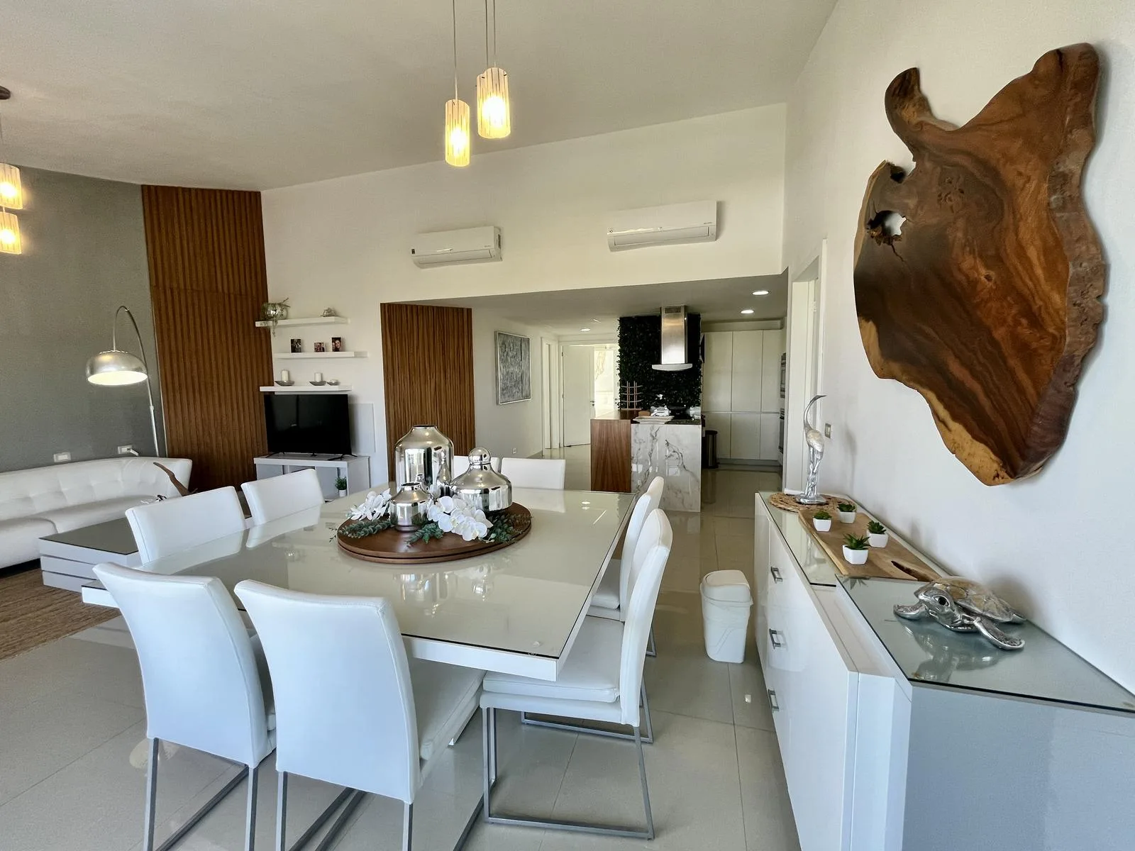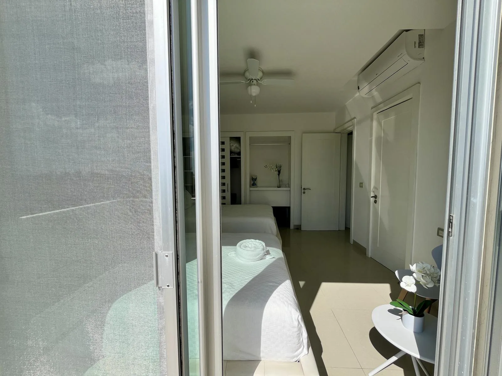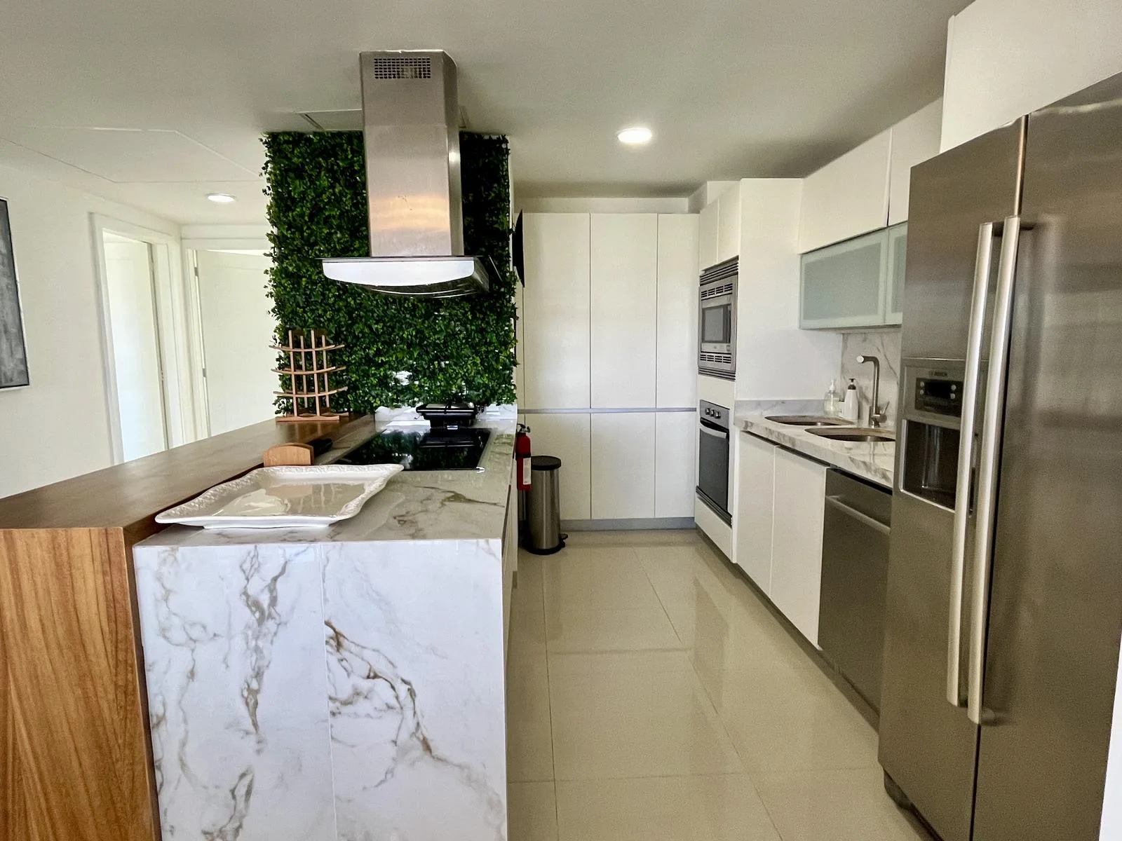 The residence provides direct beach access. On-site amenities include resort-style swimming pools, a fully equipped fitness center, lush green areas, and tropical gardens.