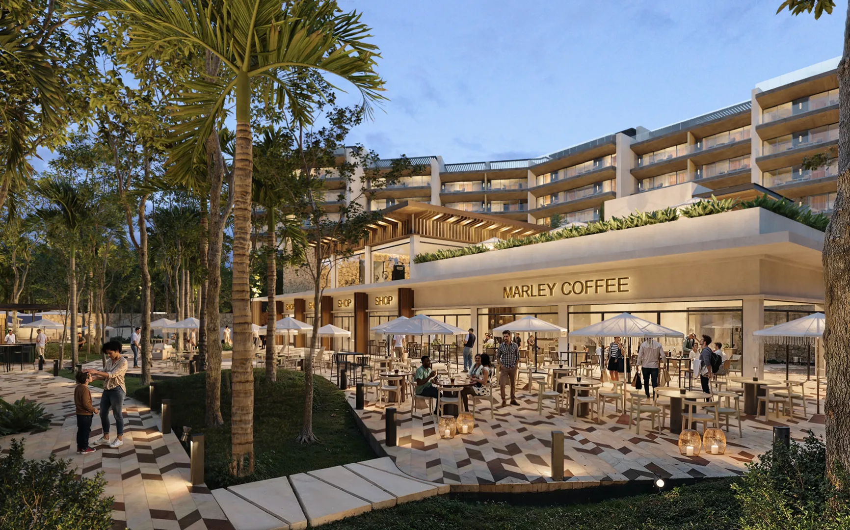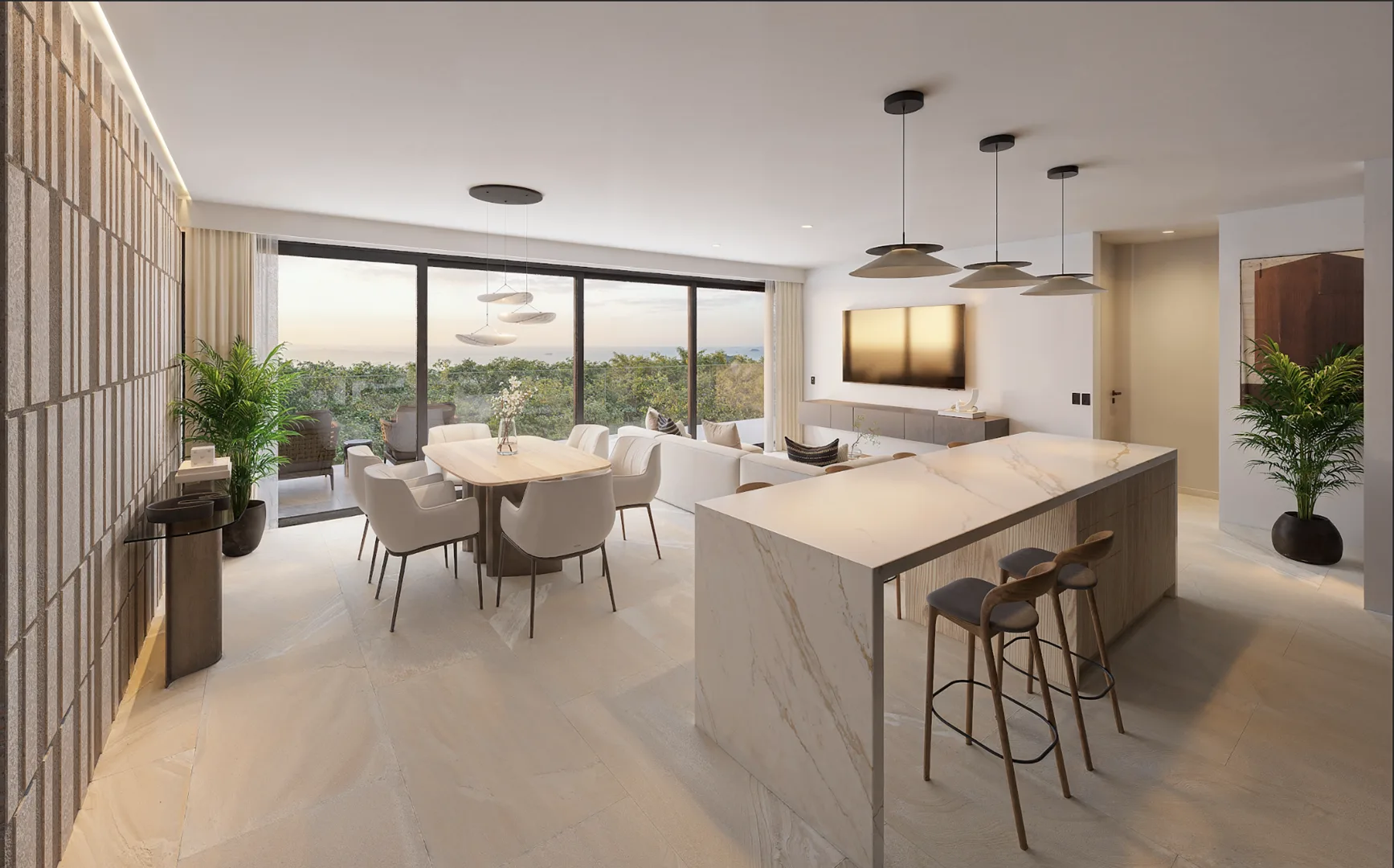 The development offers one and two-bedroom apartments, along with three-bedroom penthouses. These residences feature ocean and sunset views. Expansive terraces provide space to enjoy the climate and sea breeze.