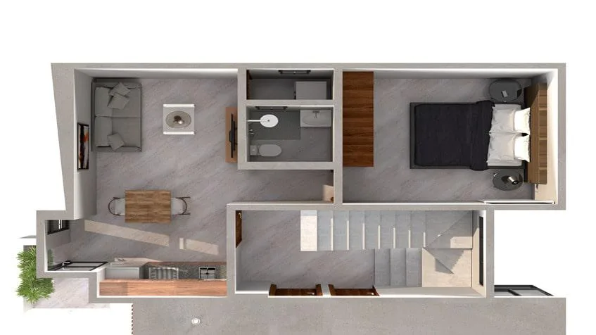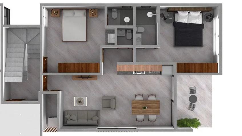 Two apartment layouts are available. The first type is a one-bedroom, one-bathroom unit featuring a kitchen, living room, and a garden, with a size of 40 square meters (approximately 430 square feet). The second type is a two-bedroom unit with two and a half bathrooms, a kitchen, a living room, and a terrace. This layout includes a lock-off option and comes with an assigned parking space.