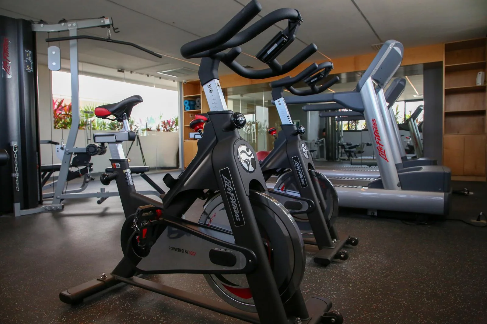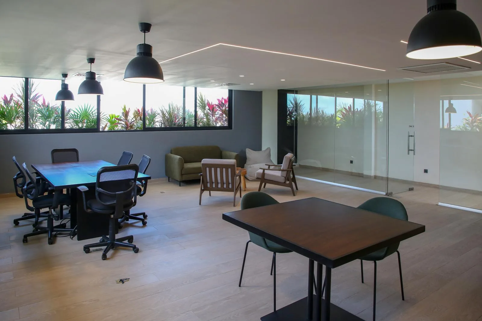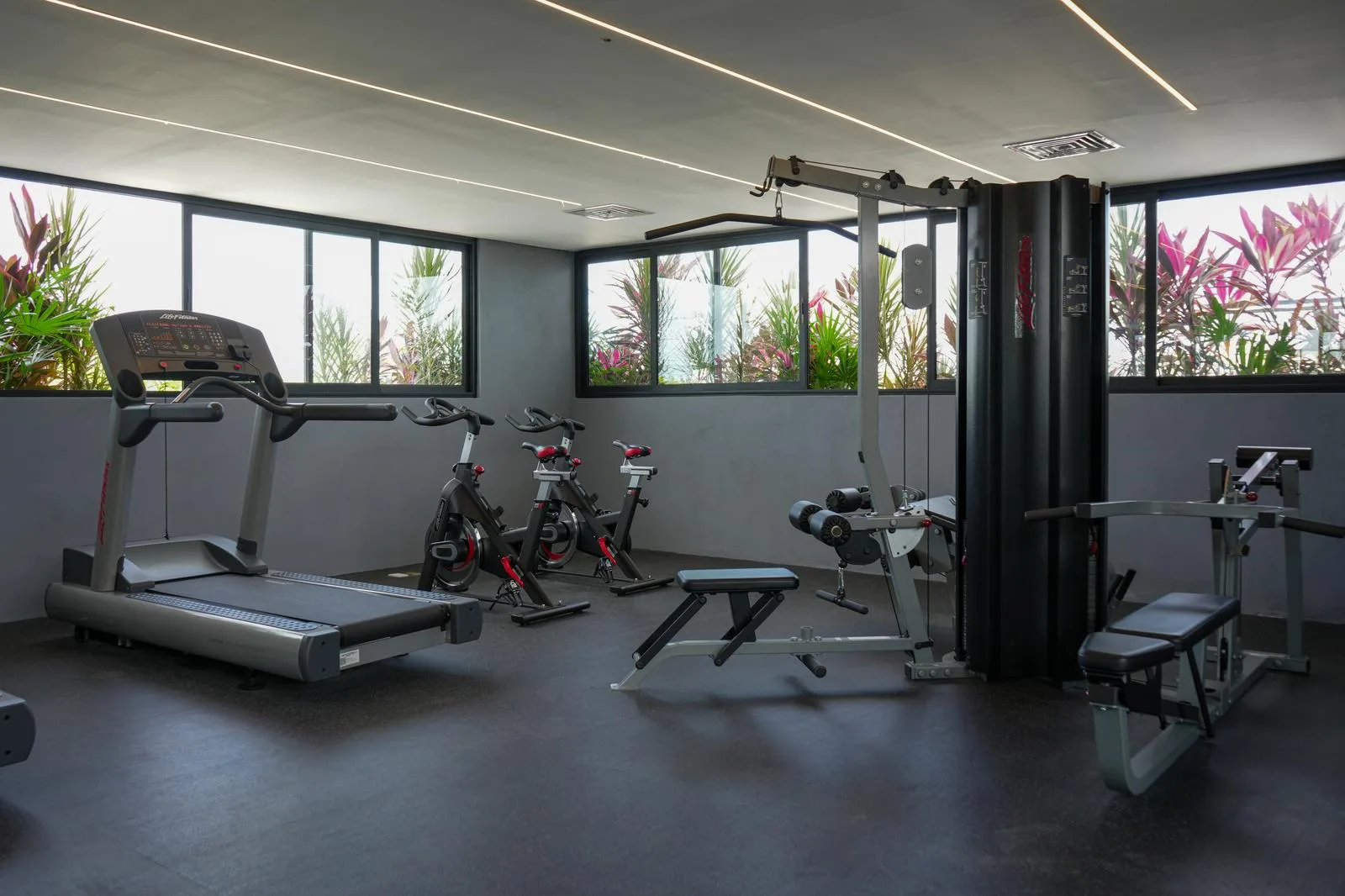 The building amenities include a Bar & Grill, two pools, a fully equipped gym, parking for residents and visitors, a coworking area, a lobby with reception, and an integrated commercial area.