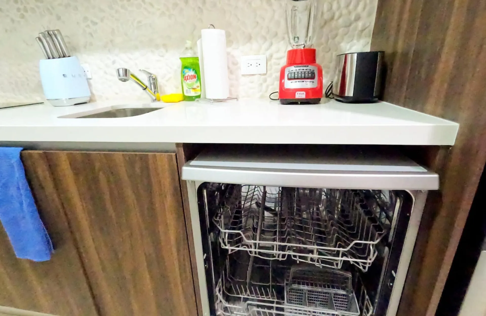 The apartment features custom glass sliding doors that separate the bedroom from the living room. The kitchen has custom cabinets and premium appliances, including a retractable hood, direct ventilation, and a dishwasher. Other highlights include a built-in closet with a top lock-off system, integrated Bluetooth speakers, a sofa bed, a smart TV, and a washer/dryer combo. An interior balcony provides a space to enjoy the Caribbean climate. The apartment is fully furnished and equipped.