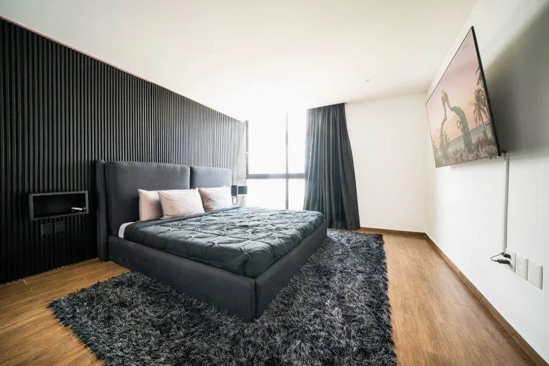 Residents have access to building amenities such as a panoramic rooftop with two pools, a fully equipped gym, a bar and grill area, and a social lounge with outdoor furniture. The building provides 24/7 security, controlled access, and high-speed internet in common areas.