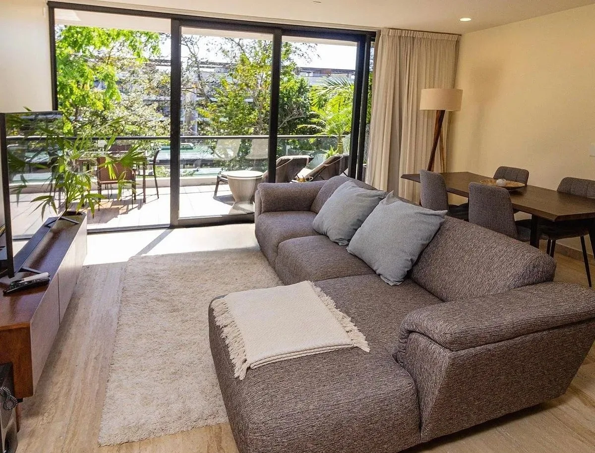 The apartment includes a laundry area and linens. The project features resort-style amenities and access to a beach club, situated in the Playacar residential area of Playa del Carmen.