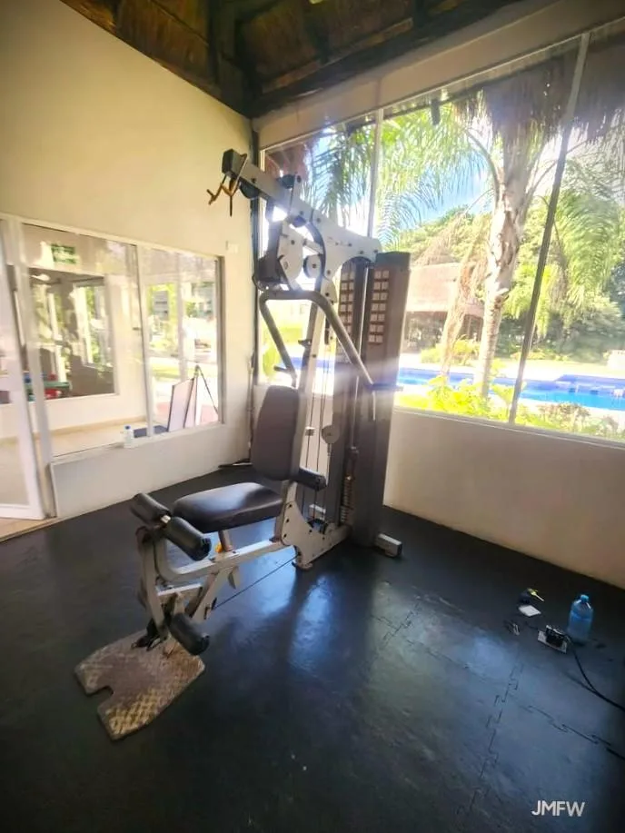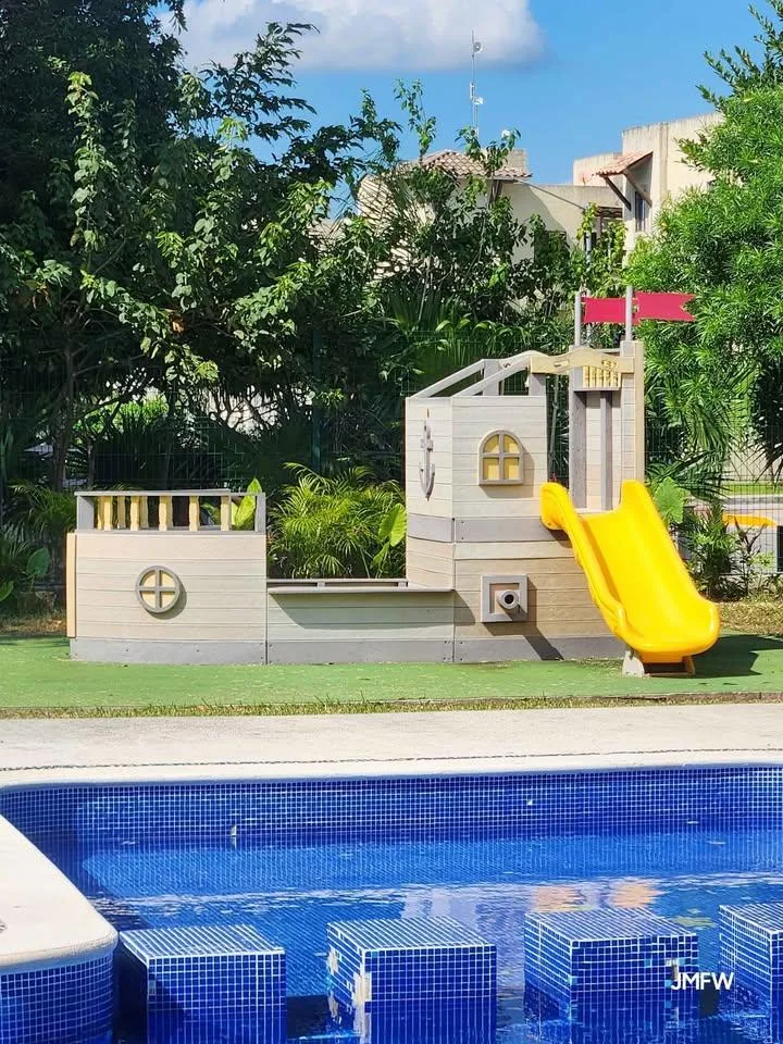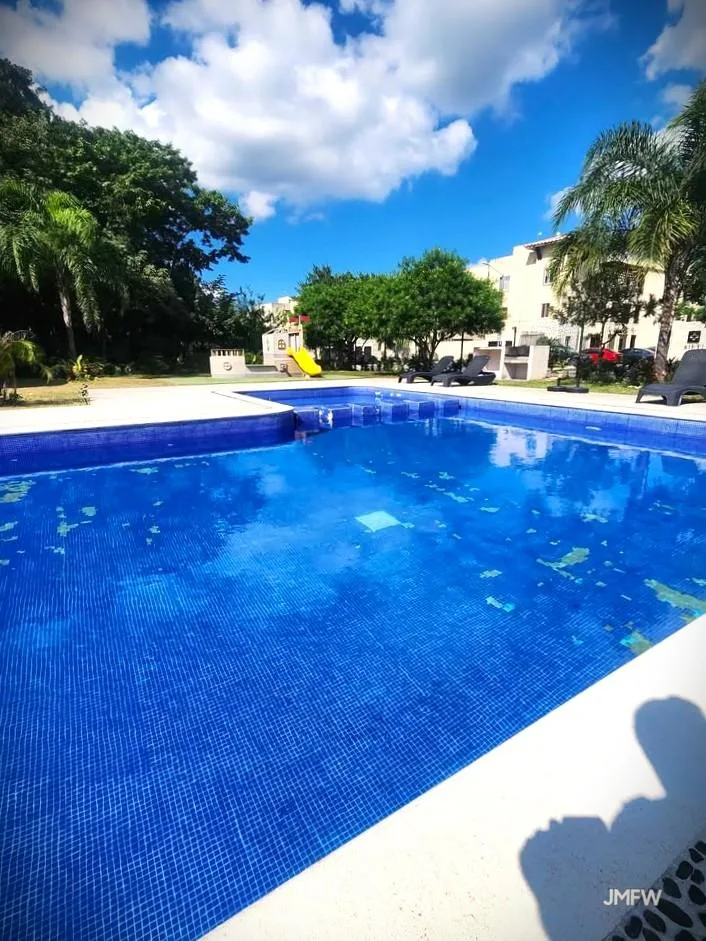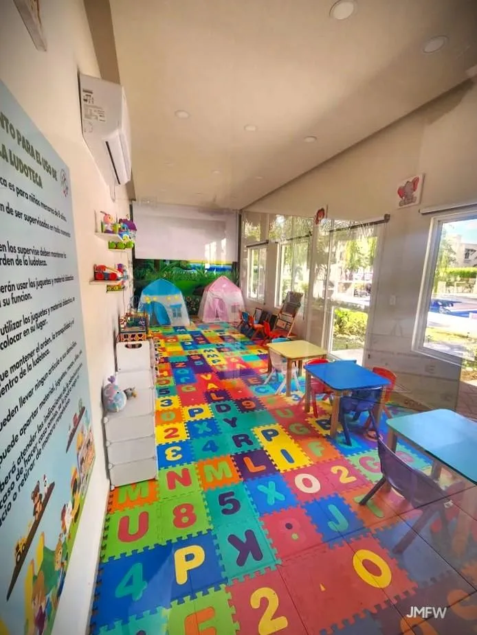 The building complex includes a swimming pool, landscaped green areas, a children's playground, and a covered palapa structure for gatherings. Additional amenities consist of a gymnasium and a playroom or game room.