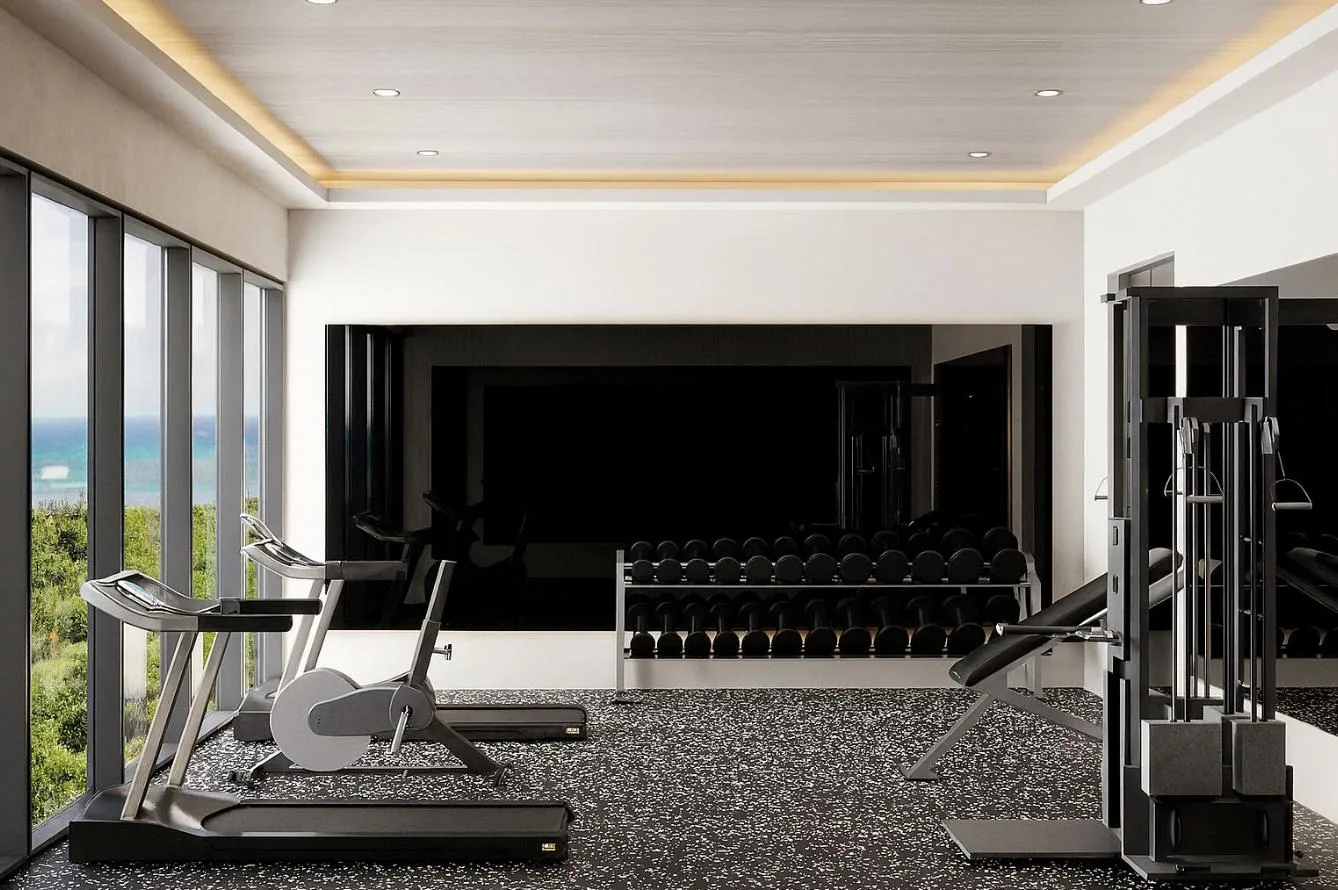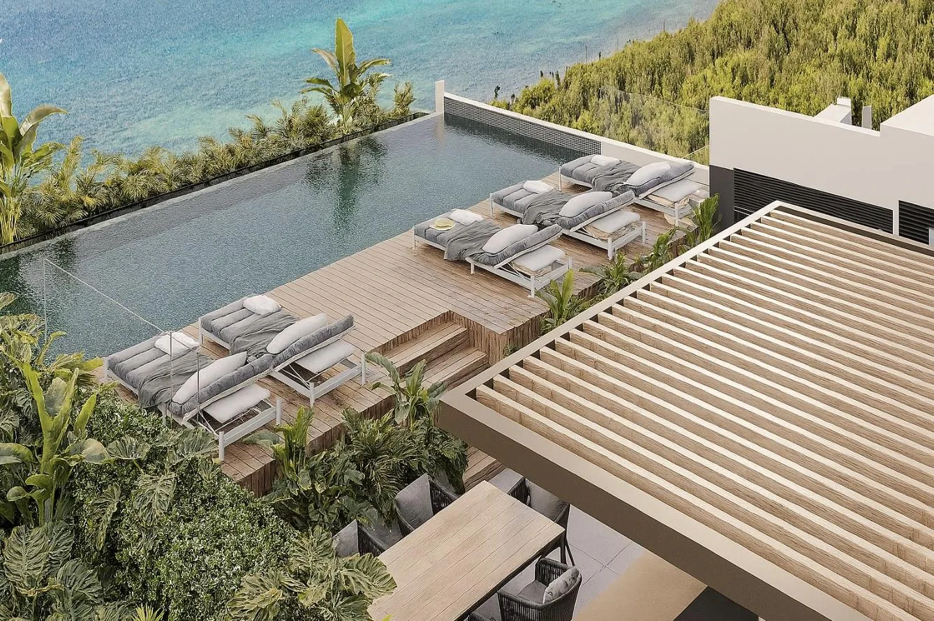 The building features a rooftop infinity pool with ocean views and direct beach access. Additional amenities include a gym, an elevator, a lobby, and security. The property also offers sunbeds, laundry facilities, and commercial spaces.