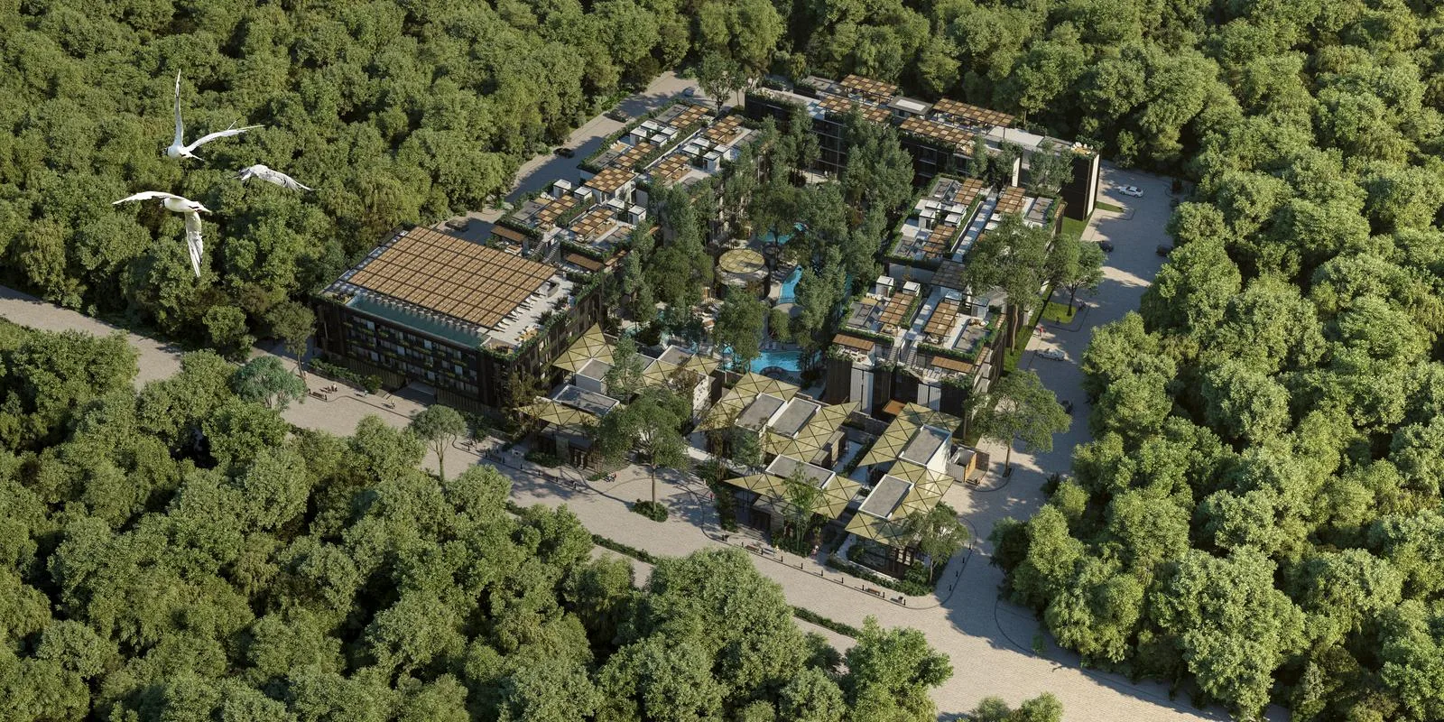 The development incorporates sustainable architecture and eco-efficient techniques, designed to harmonize with the natural environment and prioritize ecosystem conservation. It features unique amenities such as The Root, a farm-to-table restaurant.