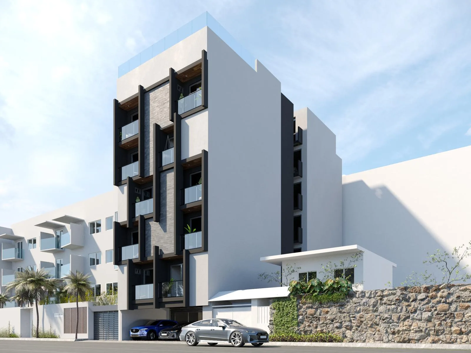 The project comprises 22 units distributed across the ground floor, five levels, and a rooftop.
