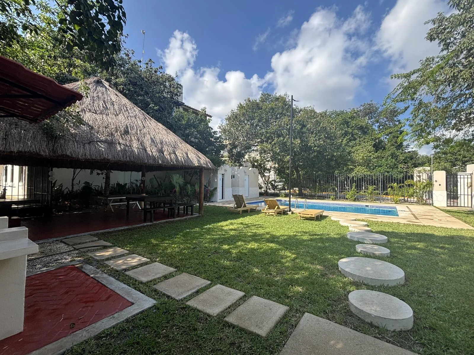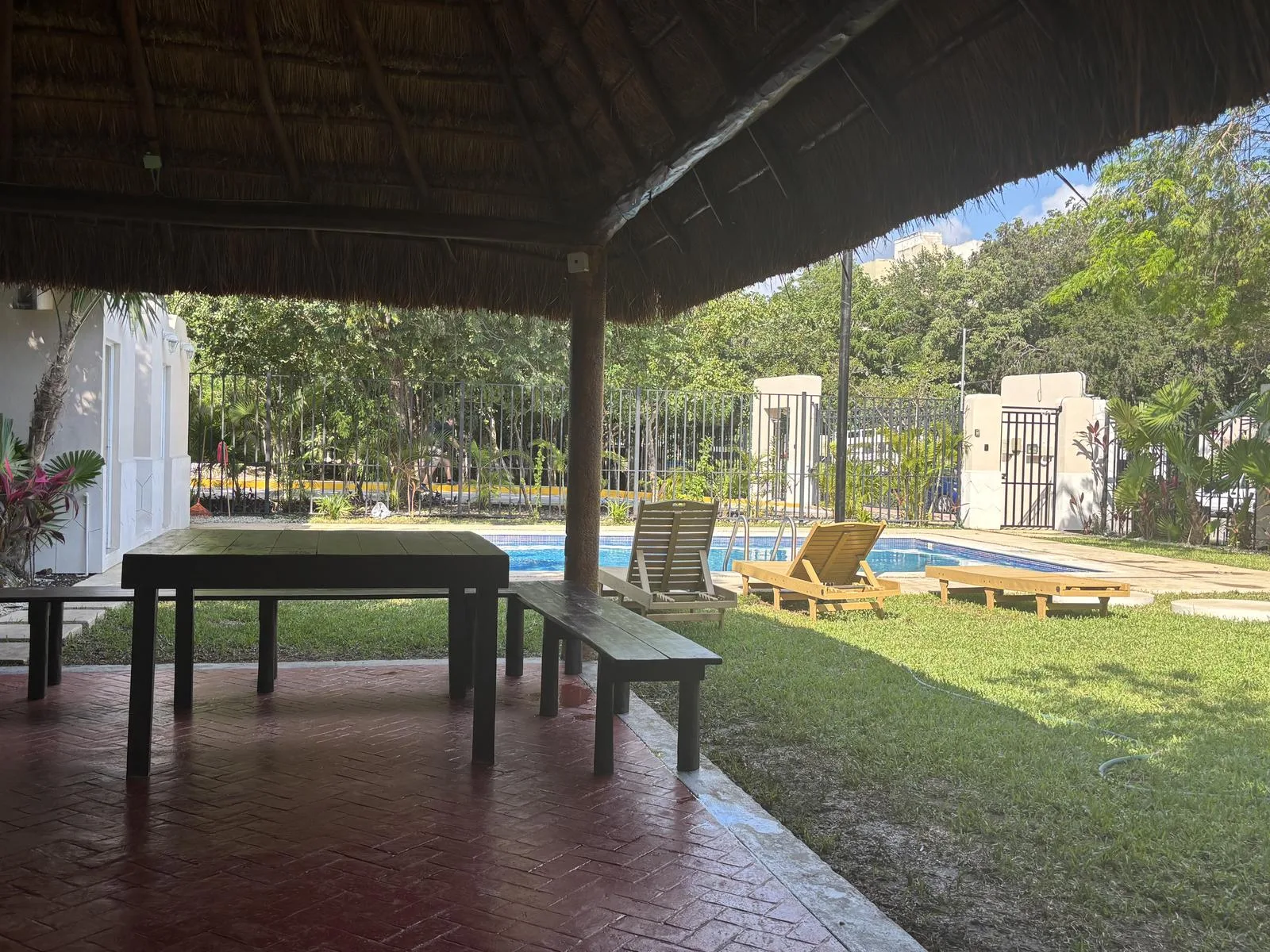 The residential complex offers amenities including a pool, a palapa, a barbecue area, visitor parking, bicycle space, and secure common family areas.