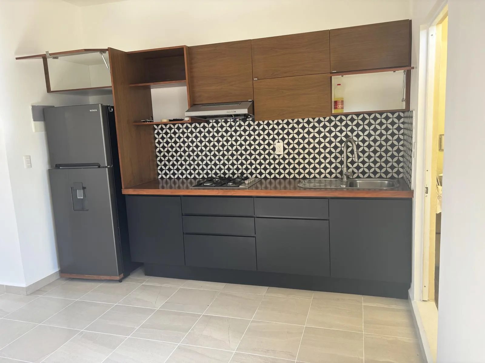 The integrated kitchen is equipped with a gas stove and refrigerator. A service patio with a boiler is provided, suitable for a laundry area.