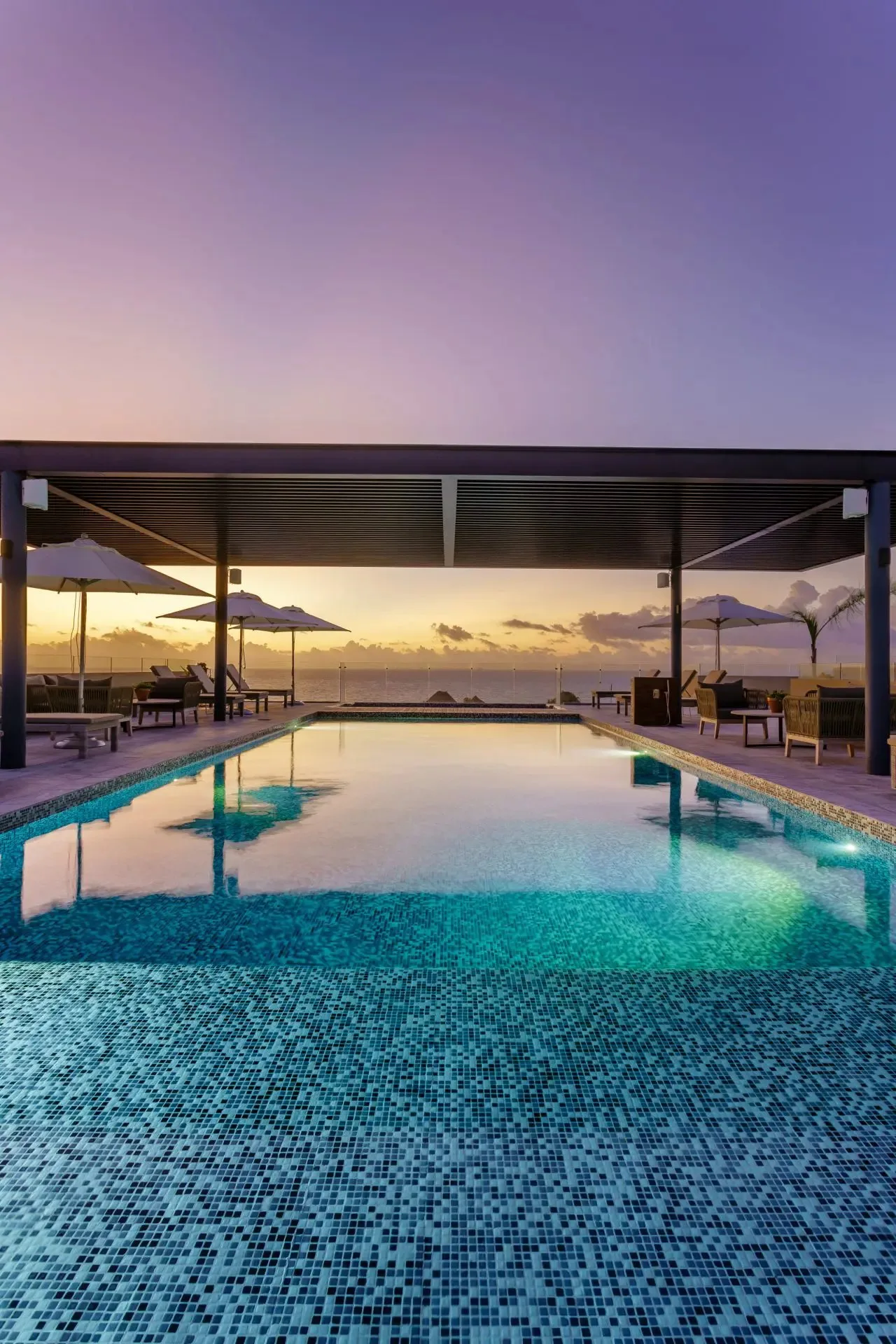 Building amenities include a concierge and front desk service, a restaurant, and room service. The property features a spa, two elevators, and a rooftop with an infinity pool. Units offer ocean and panoramic views.