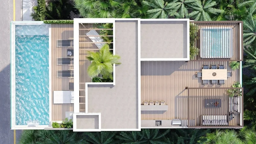 This boutique development consists of 21 units distributed across 7 levels, situated in the Zazil-Ha neighborhood of Playa del Carmen, Quintana Roo. It is located on 44th Street North, between 10th and 15th Street. The design features a minimalist style with neutral tones and natural finishes.