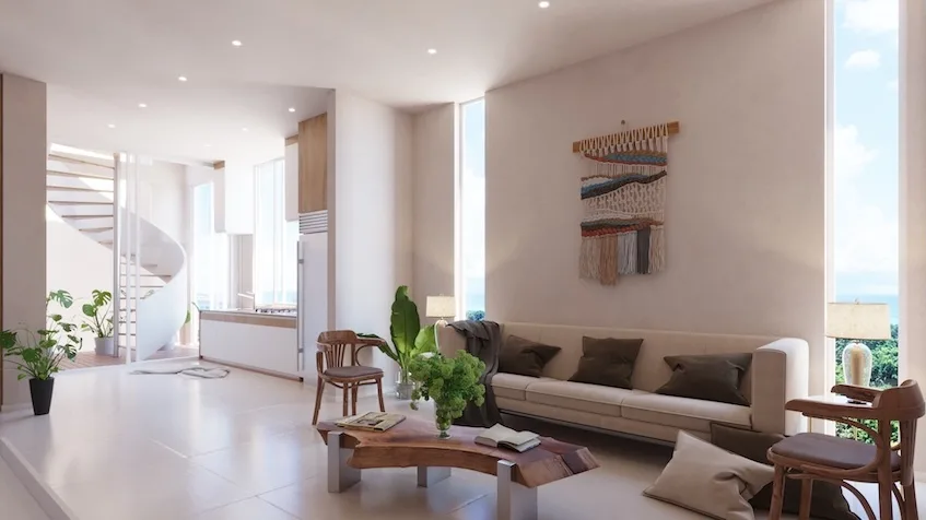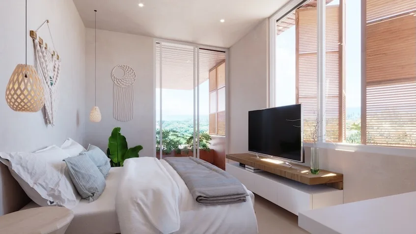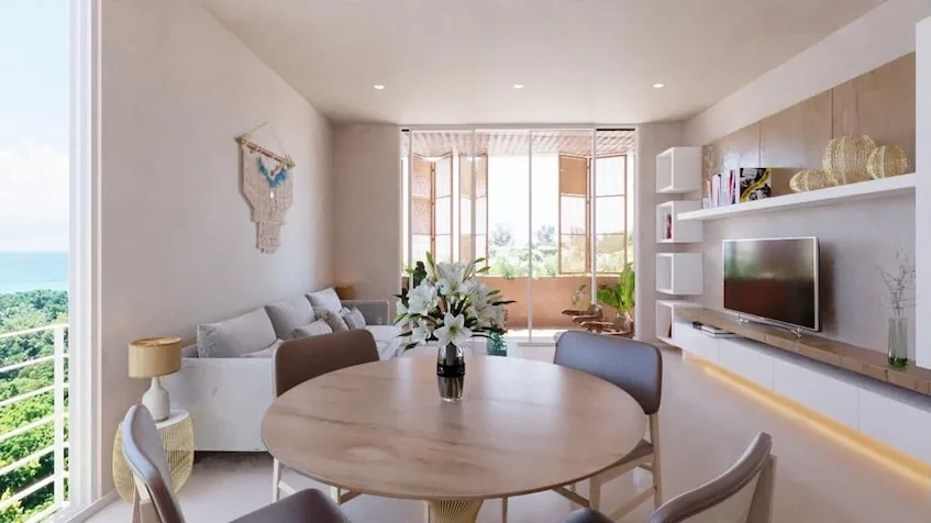 The project offers two- and three-bedroom apartments. Units are designed with high ceilings, ocean views, and spacious terraces, with the option of a private jacuzzi. One available typology is a 98 square meter two-bedroom apartment with two bathrooms, a living and dining area, and an equipped kitchen.